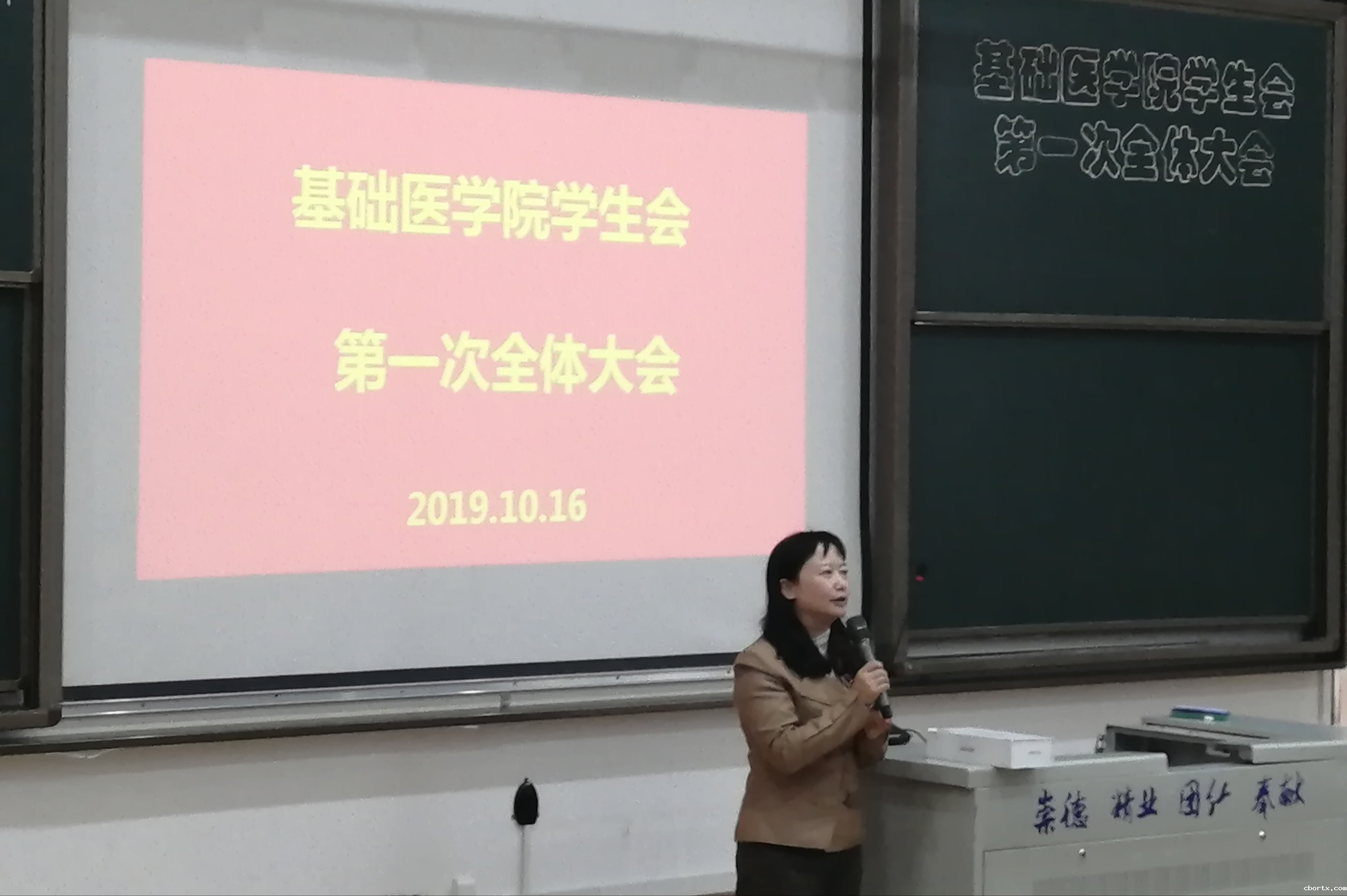 大会最后一项议程,党委副书记彭文彬老师致辞,彭老师先是对近期学院已经开展的奖助学金的评定,以及即将开展的临床专业认证、成人礼三个工作做了总结与规划。并从工作中提出了对全体学生会成员的三个期望,第一,勤于学习;她希望同学们充分利用好学生会这个成长平台,向老师和优秀的学长学姐学习,继承和发扬基础医学院学生会的优良传统和优秀品质。在日后的工作中培养实干精神、努力克服困难。第二,团结合作;希望各部门之间加强联系,增强沟通交流与合作。学生会的各部门的同学们要互相帮助、共同进步,努力提高综合素质。第三,乐于奉献;无私帮助他人,为同学们更好的服务,明确好自身定位,时刻注意作为基础学生会成员应有的言行。彭老师的讲话给全体学生会同学受益良多,也为全体学生会今后工作的开展点明了方向。