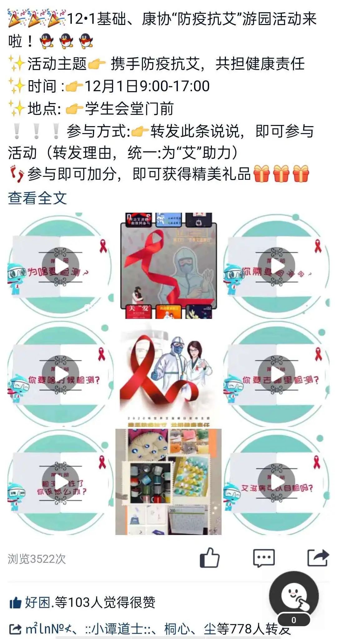 为引起校内外同学、身边亲朋好友对知艾、防艾的重视,我们活动倡议同学们通过QQ等新媒体方式,向亲友、同伴转发防艾相关知识。活动当天,在龙榕老师、郑福云老师、晋竹筠老师及朱敏老师和焦锋老师的现场指导下,据统计,有1359名同学转发并参与我们的防艾抗疫活动,大家一起共同为防艾助力!