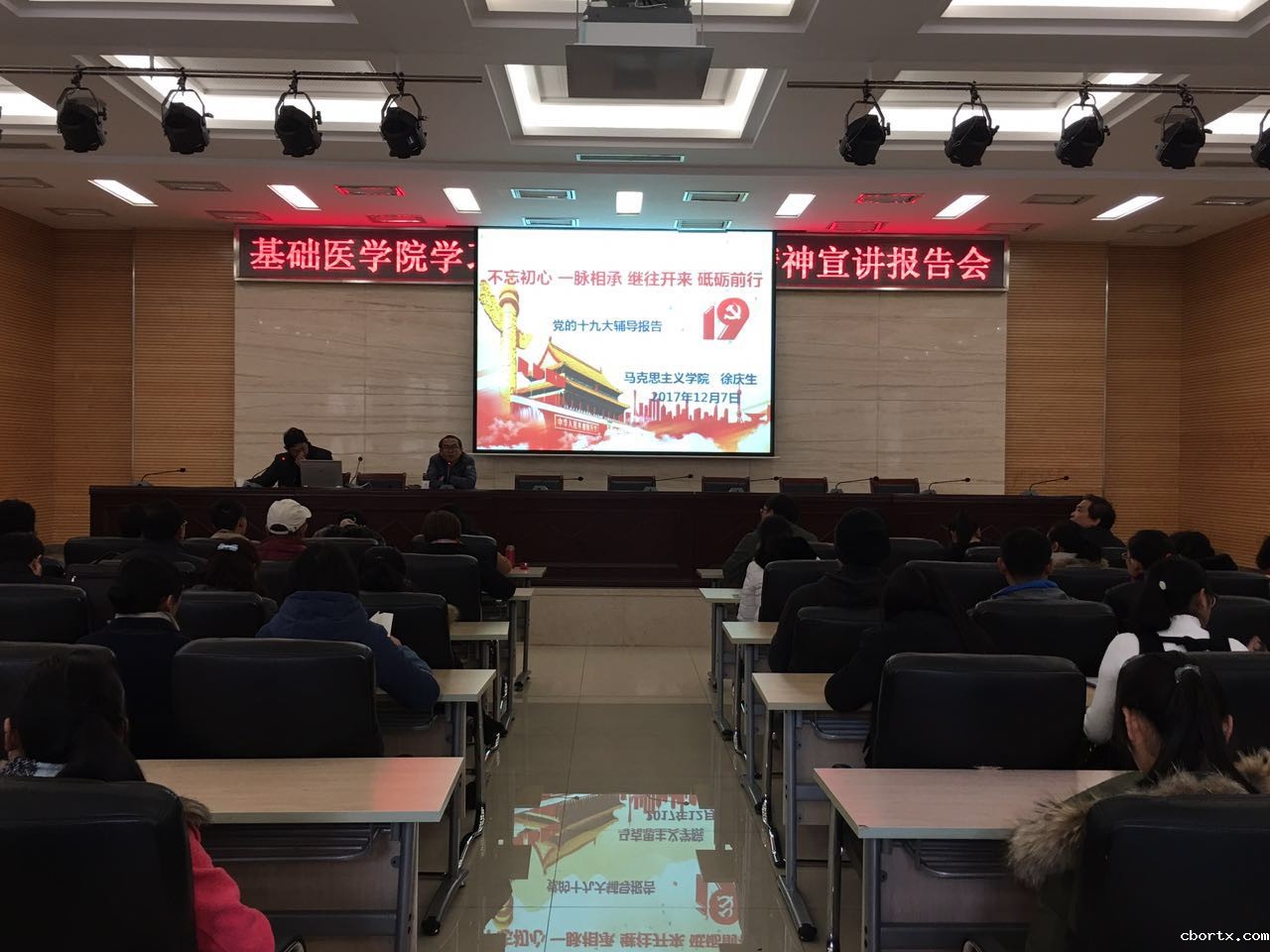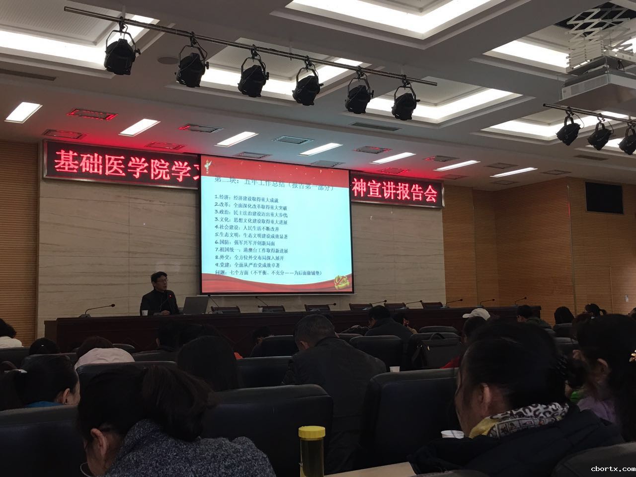 宣讲会由基础医学院党委书记杨正洲主持,学院部分党政领导、各部门负责人、党支部书记、无课教师、学生代表180余人参加了宣讲会。
