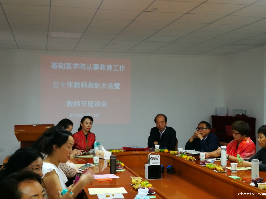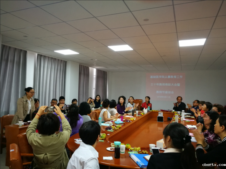 9月11日上午,在第34个教师节来临之际,学院在基础医药大楼621会议室召开从事教育工作三十年教师表彰大会暨教师节座谈会。学院党政领导、受表彰教师、无党派及民主党派教师代表、2018年全体新进教师参加了表彰大会。会议由学院党委书记杨正洲主持。