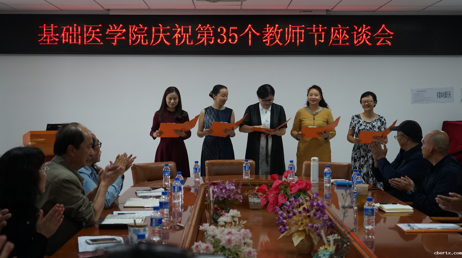 99日下午,在第35个教师节来临之际,学院在基础医药大楼621会议室召开庆祝第35个教师节座谈会。学院党政领导、从教三十年教师、无党派及民主党派教师代表、2019年全体新进教师参加了表彰大会。会议由学院院长孙俊主持。