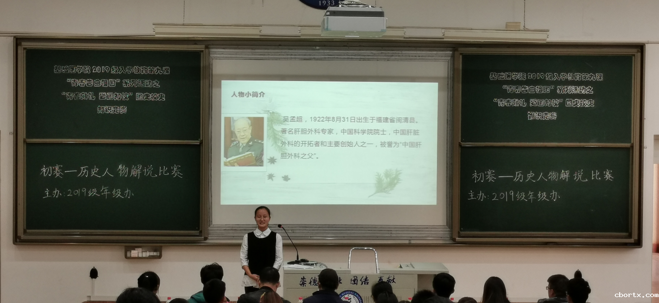 2019年10月19日晚17:30,由基础医学院2019级年级办主办,2019级全科医学三大班承办的“青春献礼?爱国知校” 国史校史知识竞赛初赛——历史人物解说大赛在教学楼5104顺利举行。