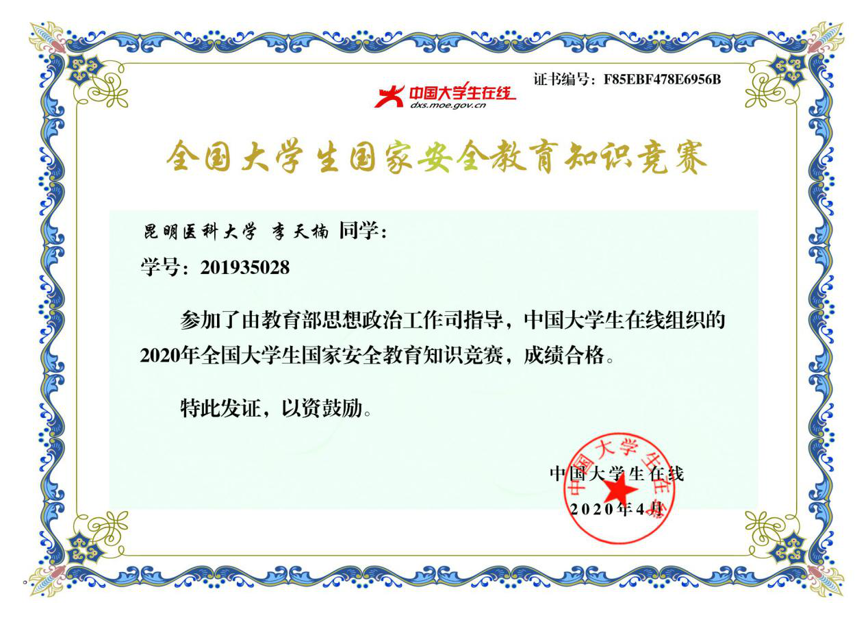 基础医学院全体同学于2020年4月14日早上10点在官方平台上观看“千万学生同上一堂国家安全教育课”,因有课或当地停电没有参加在线直播学习的学生于4月15日以前通过链接或二维码登录进行回看,共计4351名学生均提交学习心得,学习心得内容丰富,深扣课程主题;另外,同学们也积极参加了国家安全知识在线问答活动和易班手机端推送的有关全民国家安全教育日知识的学习。此次系列学习活动极大的调动了同学们爱国的热情,活动后同学们积极讨论,结合日常、学校生活以及本次新冠疫情的爆发,从自己、社会、国家等方面讨论了国家安全的历史、发展和重要性。