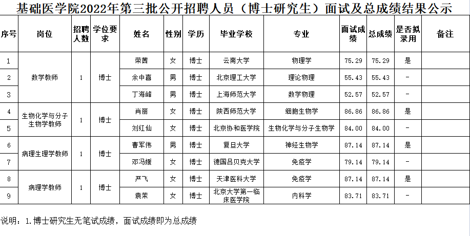 按照18luck备用登录2022年公开招聘人员面试考核工作的相关要求,我院于2022年10月13日对进入面试的应聘人员进行了学院线上面试,本着公平、公正、择优录用的原则,根据招聘岗位不同,进行了试讲以及综合素质面试,现将基础医学院2022年第三批公开招聘人员(博士研究生)面试考核结果予以公示。