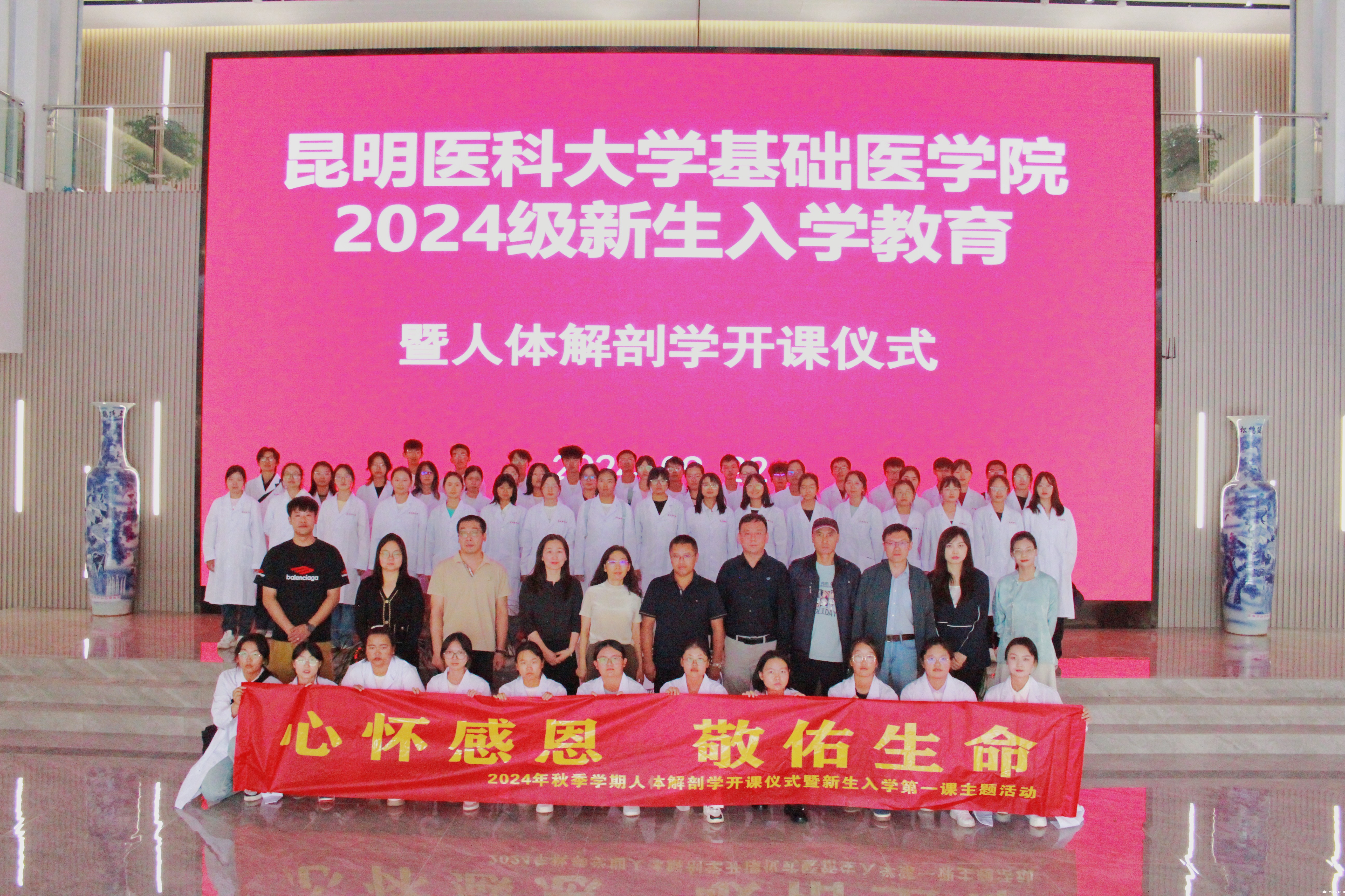 2024年9月22日下午13时,18luck备用登录基础医学院2024级新生入学教育暨人体解剖学开课仪式在人体科学馆成功举行。学院副院长杨新旺、学生工作办公室主任杨青青、人体解剖学与组织胚胎学系、人体解剖学实验室教师代表及2024级新生代表出席仪式,仪式由人体解剖学实验室主任于洋主持。