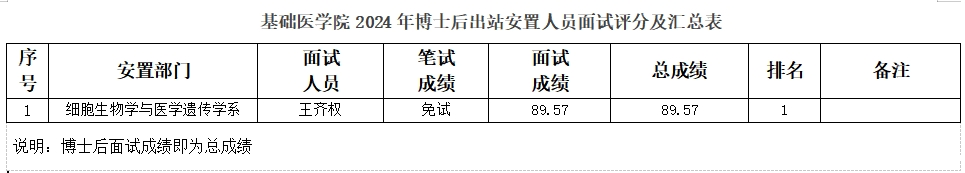 按照18luck备用登录2024年博士后出站安置面试考核工作的相关要求,我院于2024年10月16日对出站博士后王齐权进行了面试考察,本着公平、公正、择优录用的原则,进行了试讲以及综合素质面试,现将基础医学院2024年博士后出站安置人员面试考核结果予以公示。