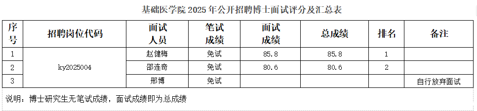 按照18luck备用登录2025年公开招聘人员面试考核工作的相关要求,我院于2025年11月4日对公开招聘博士工作人员进入面试人员进行了面试考察,本着公平、公正、择优录用的原则,进行了试讲以及综合素质面试,现将基础医学院2025年公开招聘博士工作人员面试考核结果予以公示。