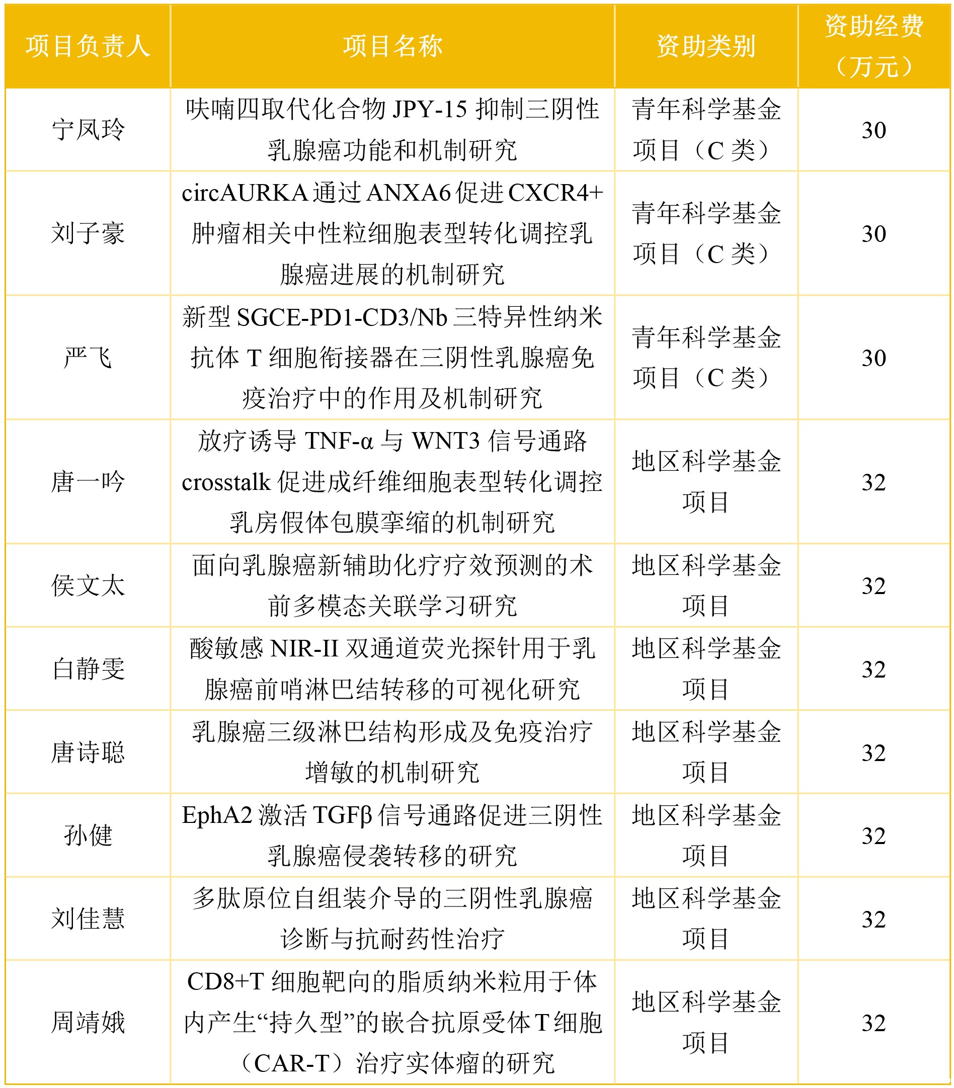 2025年8月27日,国家自然科学基金委正式发布了《关于2025年国家自然科学基金集中接收申请项目评审结果的通告》。云南省乳腺癌精准医学重点实验室表现出色,共有10个乳腺癌相关项目获国家自然科学基金立项资助,其中青年项目3项,地区科学基金项目7项。