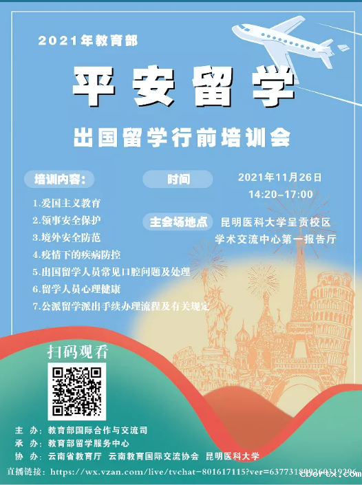 由教育部国际交流与合作司主办、教育部中国留学服务中心承办,云南省教育厅、云南国际教育交流协会与18luck备用登录共同协办的2021“平安留学”出国留学行前培训会将于2021年11月24日下午举行,会议邀请了相关领域知名专家就爱国主义、领事保护、境外安全防范、疫情下的基本防控、口腔保护及心理健康等专题进行讲座,欢迎有意向出国学习的师生线上直播观看。