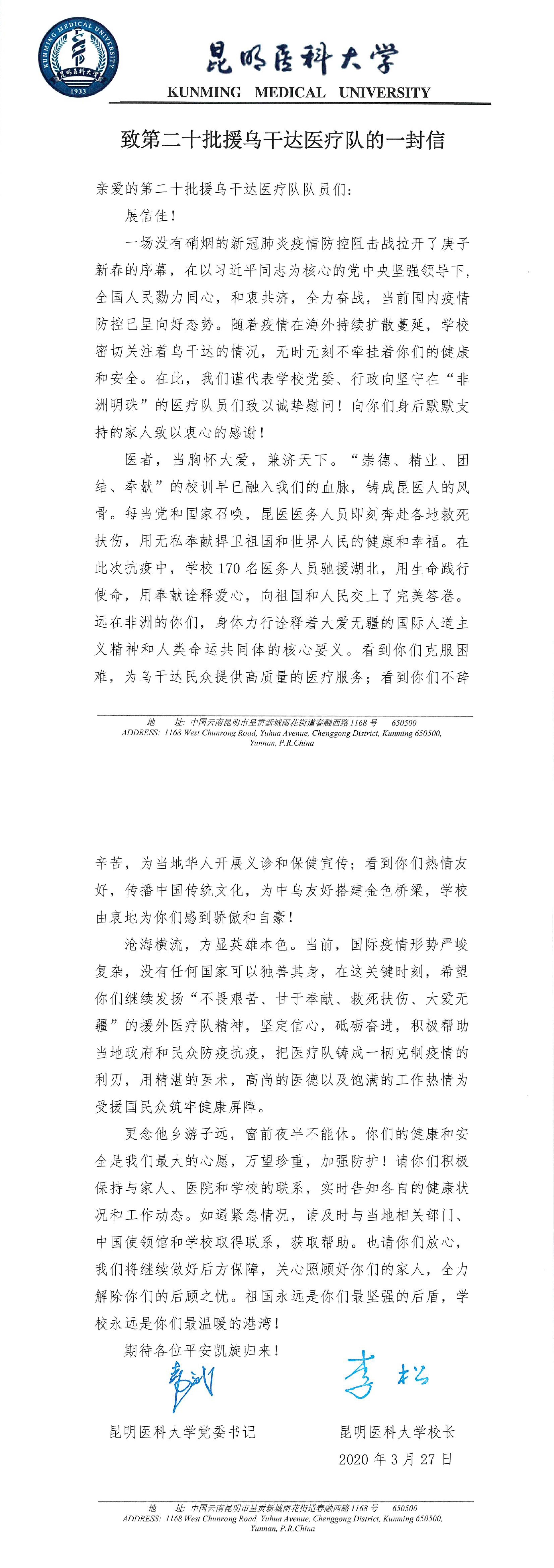 致第二十批援乌干达医疗队的一封信