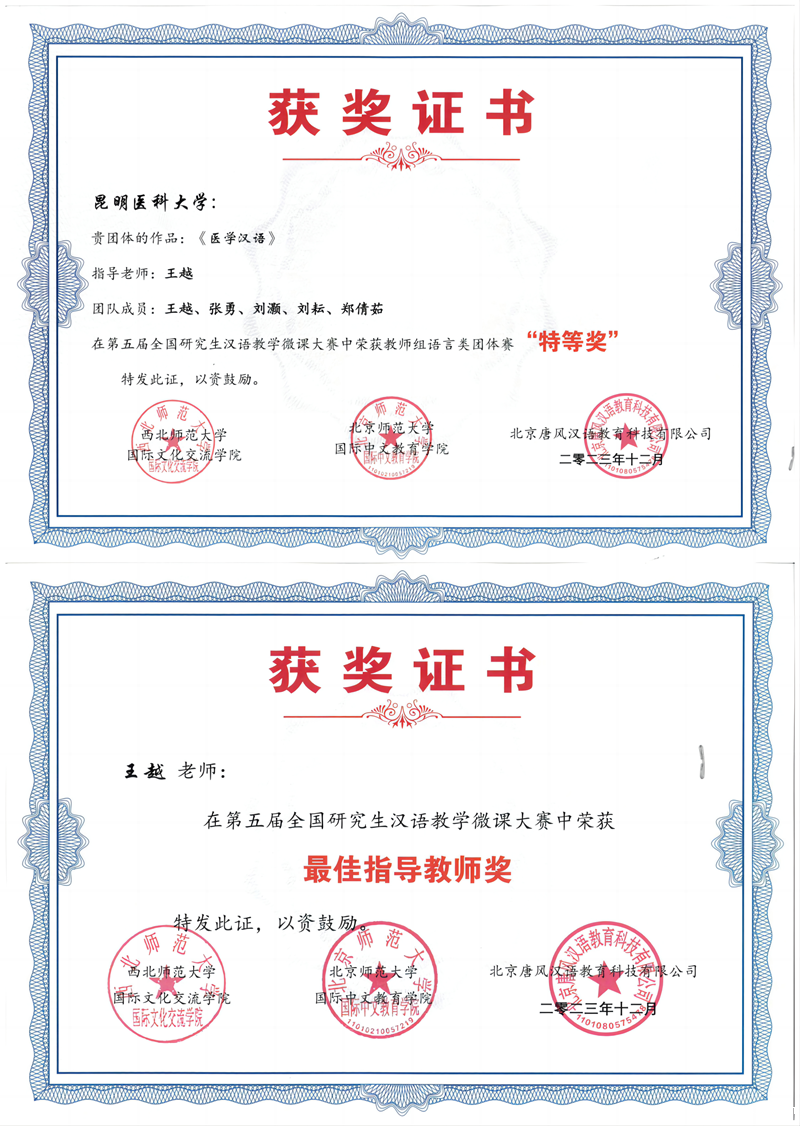 On December 4, the "International Chinese Education Curriculum and Teaching Innovation Seminar and the Award Ceremony of the 5th National Chinese Teaching Micro-Course Competition" was held in Northwest Normal University, Lanzhou. The series micro courses "Medical Chinese" created by the Chinese Teaching and Researching team of International Education School of Kunming Medical University won the Grand Prize among the teacher group , and Chinese Teacher Wang Yue won the "Best Instructor Award". The competition has received sufficient support and guidance from the International Education School, the Medical Education Department of the Second affiliated Hospital of KMU and professional teachers in related departments.