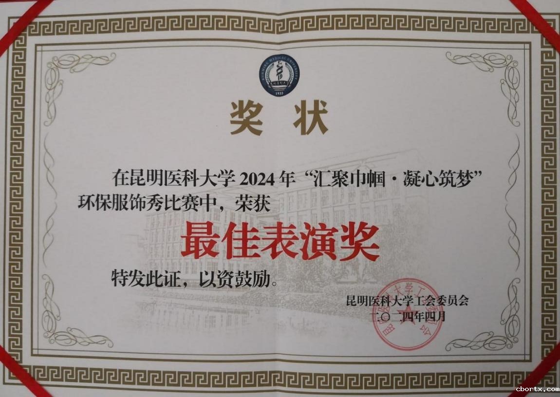2024年4月26日晚,学校“会聚巾帼·凝心筑梦”环保服饰秀比赛在呈贡校区学生会堂举行。我院节目“绿色家园同心创 巾帼筑梦展霓裳”荣获最佳表演奖。