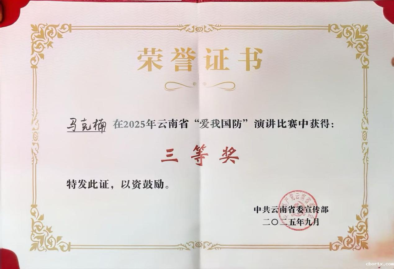 9月5日,由中共云南省委宣传部主办,中共云南省委省直机关工委、中共云南省委教育工委、云南省国资委协办的2025年云南省“爱我国防”演讲比赛决赛在昆明举办。18luck备用登录人文与管理学院马克楠同学获三等奖,学校获优秀组织奖。