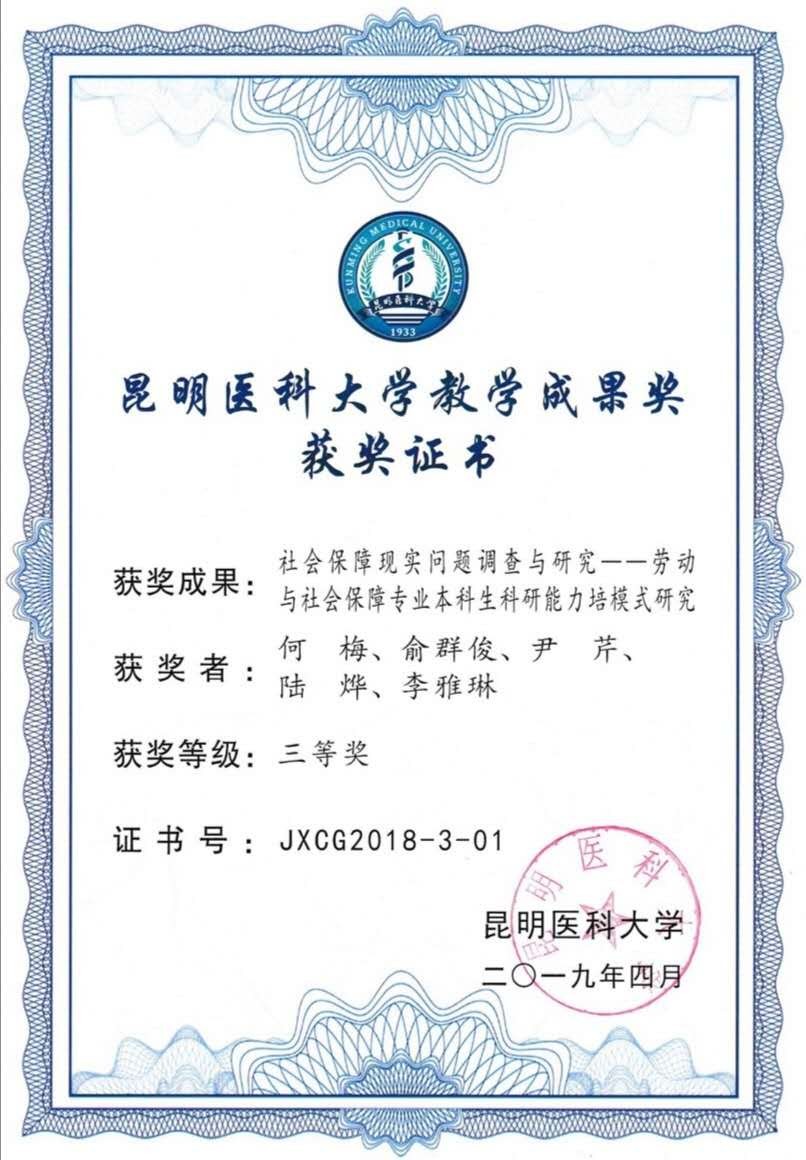 劳动与社会保障专业团队《社会保障现实问题调查与研究——劳动与社会保障专业本科生科研能力培养模式研究》荣获学校2018年教学成果三等奖