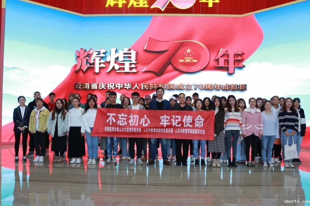 为庆祝中华人民共和国成立70周年,大力弘扬爱国主义精神,引导学院师生增强“四个意识”,坚定“四个自信”,积极践行社会主义核心价值观,激发学院师生的爱国情、强国志、报国行。2019年11月1日上午8:30在人文与管理学院院长张瑞宏教授、党委宣传委员朱永老师、团委书记邵爱婷老师的组织带领下,学院40余名同学前往云南文学艺术馆开展新中国成立70周年主题教育学习活动。