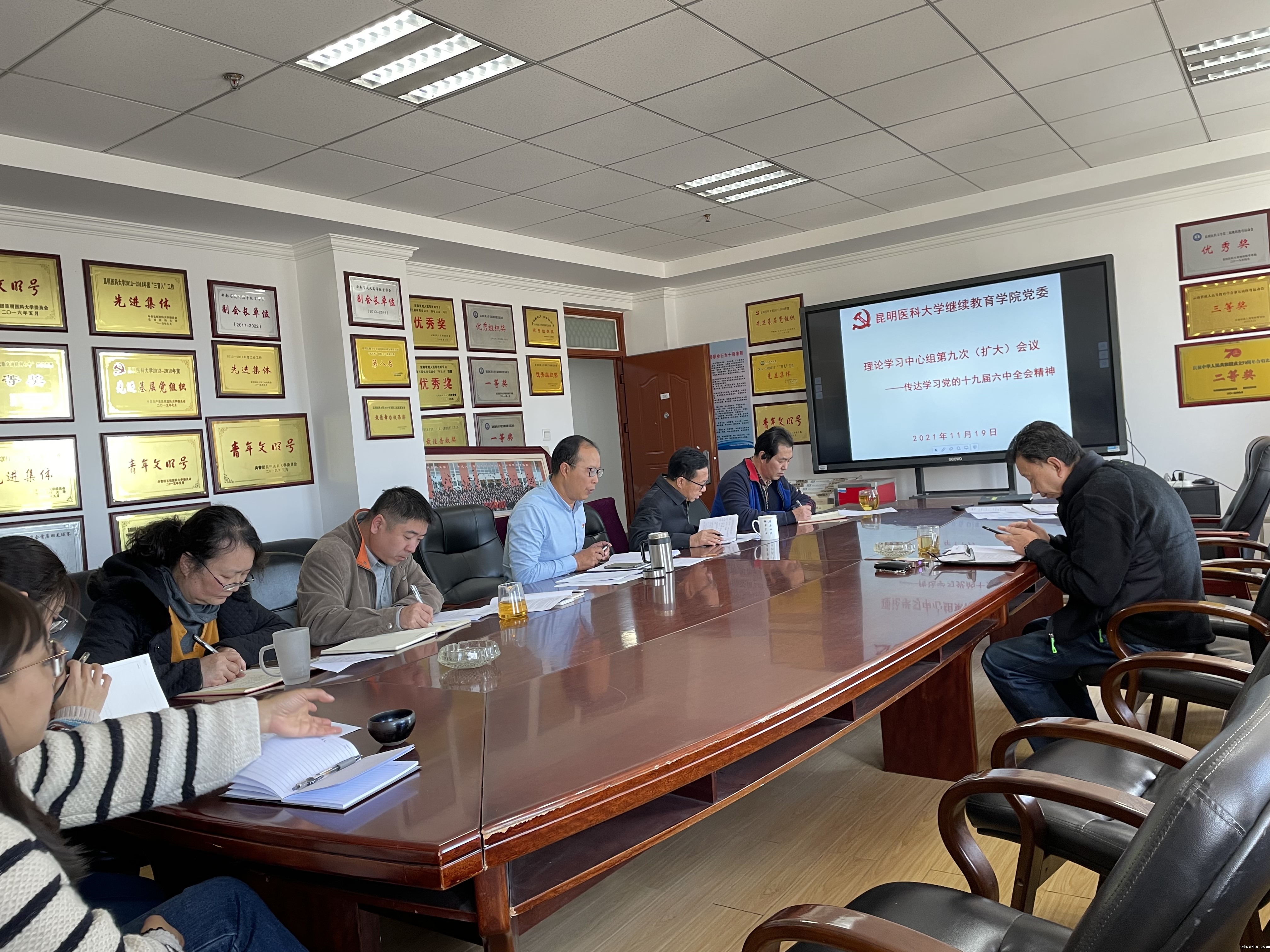 11月19日下午,继续教育学院召开2021年党委理论学习中心组第九次(扩大)会议,专题传达学习党的十九届六中全会精神。学院党委委员、党支部书记和各部门负责人参加会议。学院党委书记王念民主持会议。