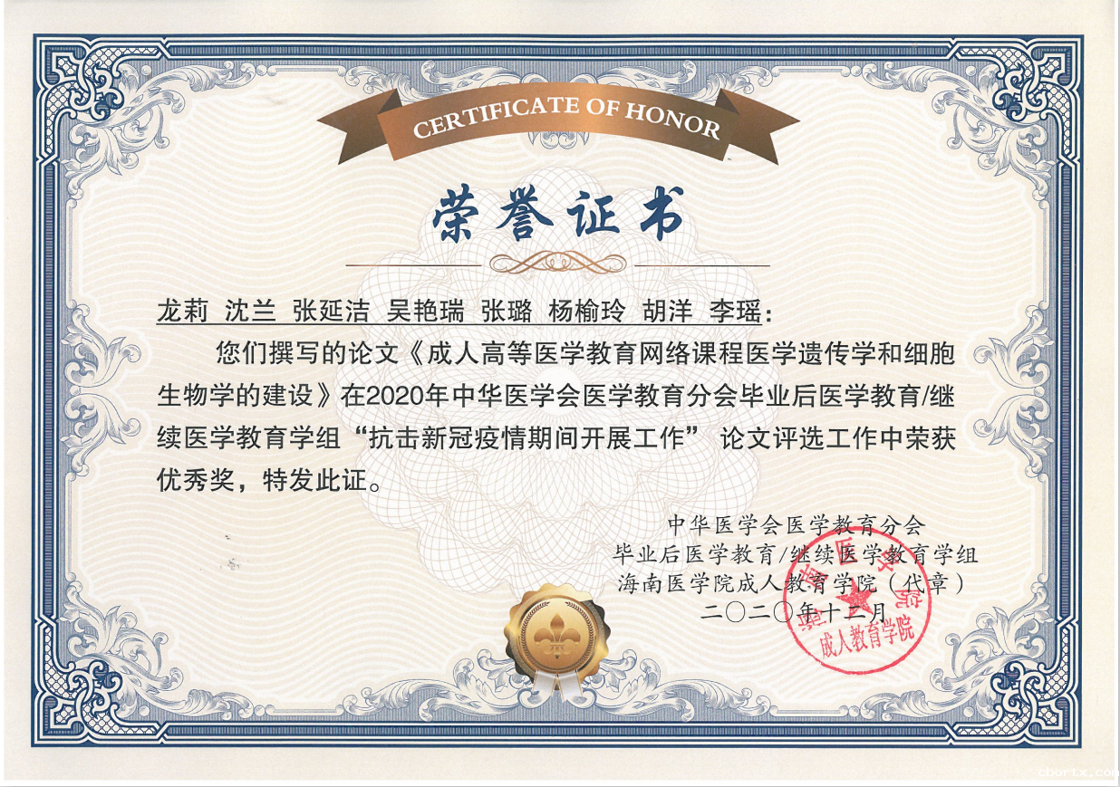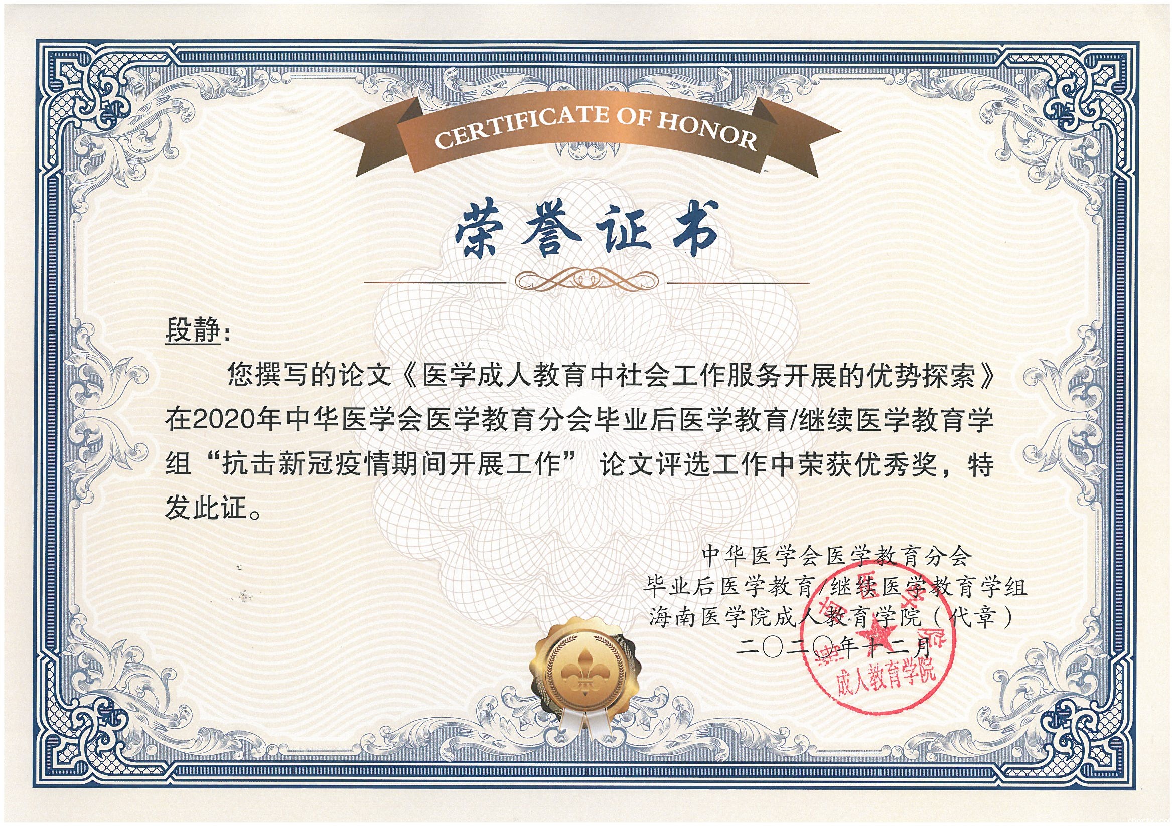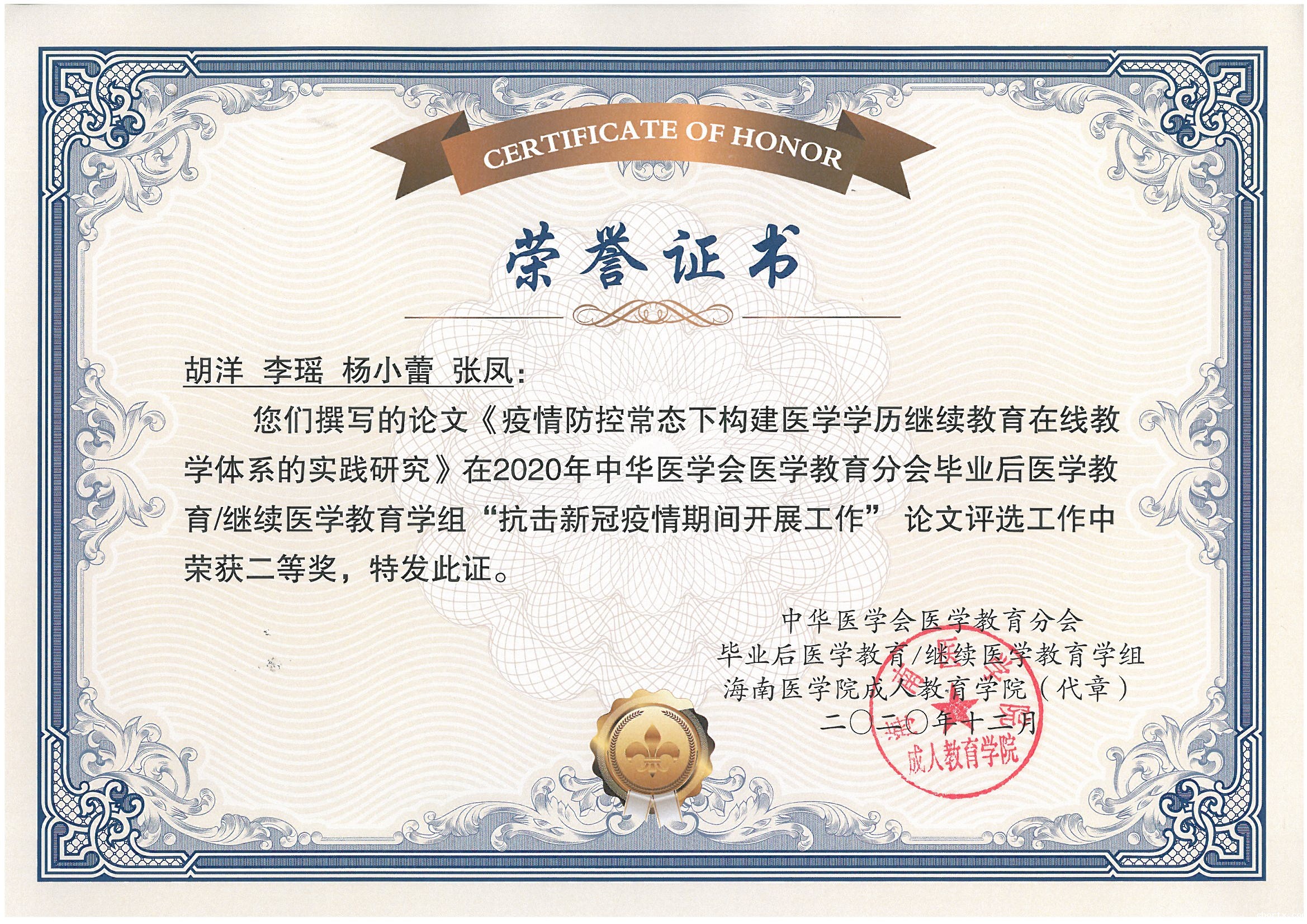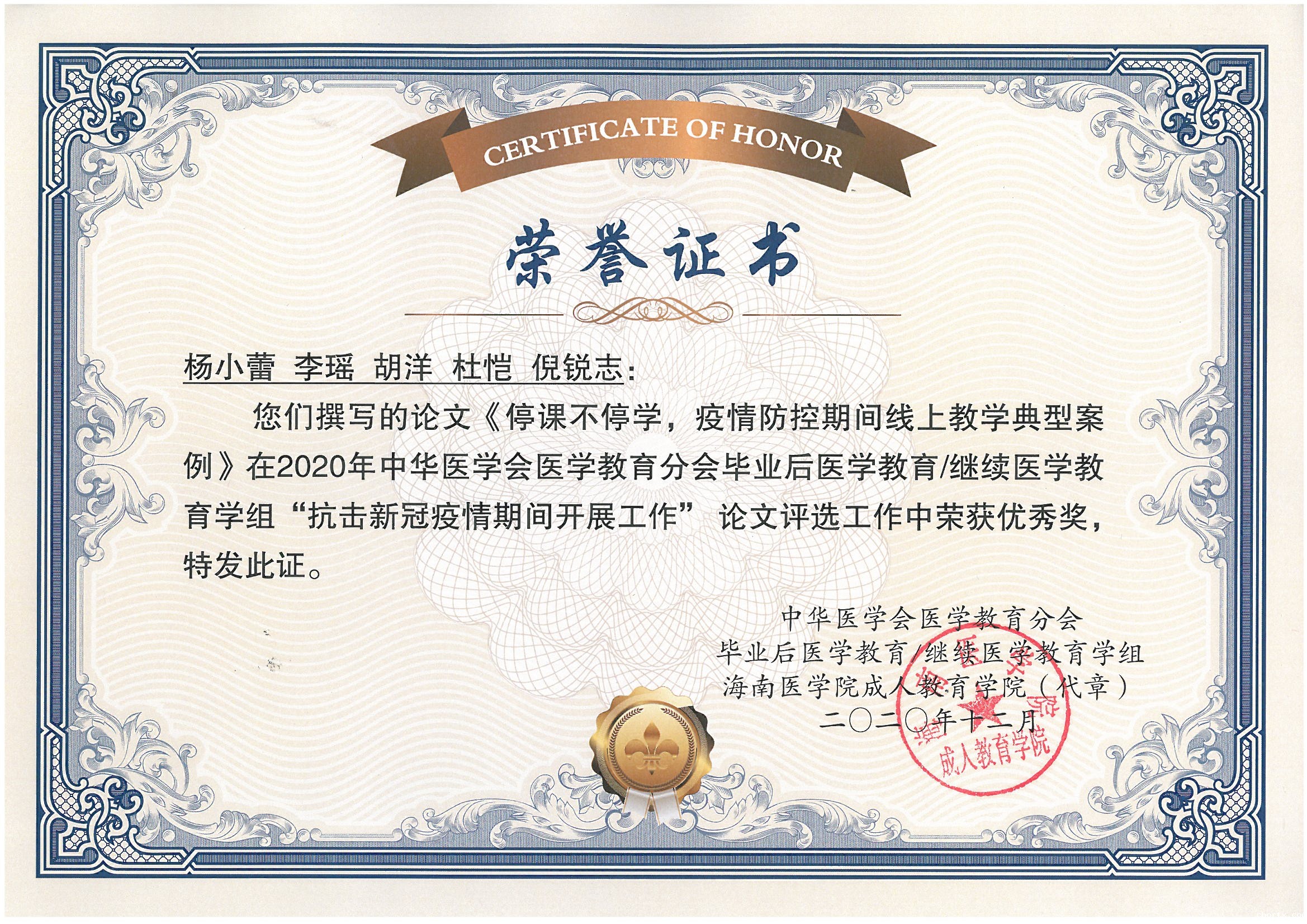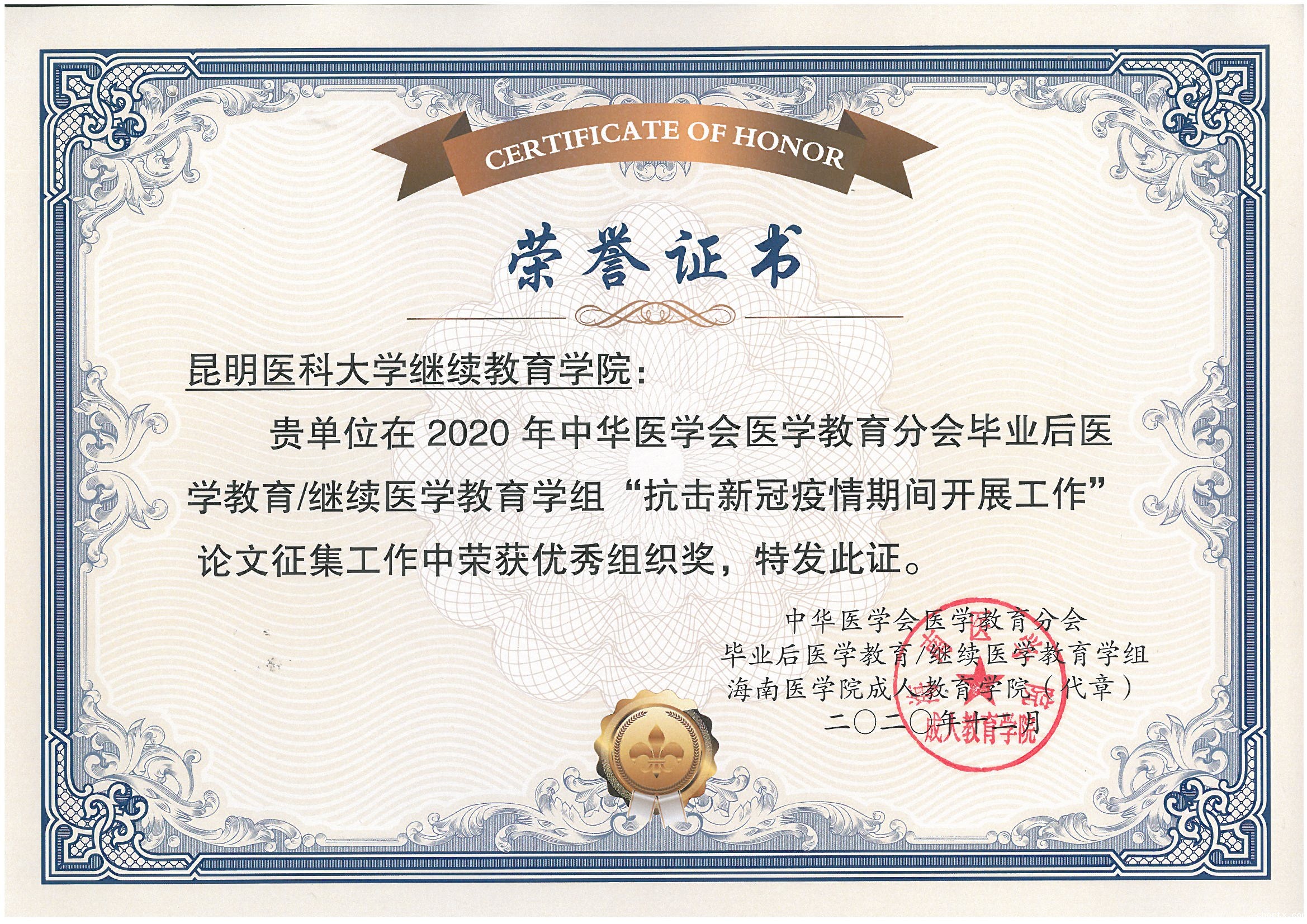 会上,还对“抗击新冠疫情期间开展工作”优秀论文进行了评选和表彰。我院以参评论文数量与中国医科大学继续教育学院、哈尔滨医科大学继续教育学院、江苏省人民医院教育处并列第一,喜获“优秀组织奖”,个人获“二等奖”1项,“优秀奖”3项。