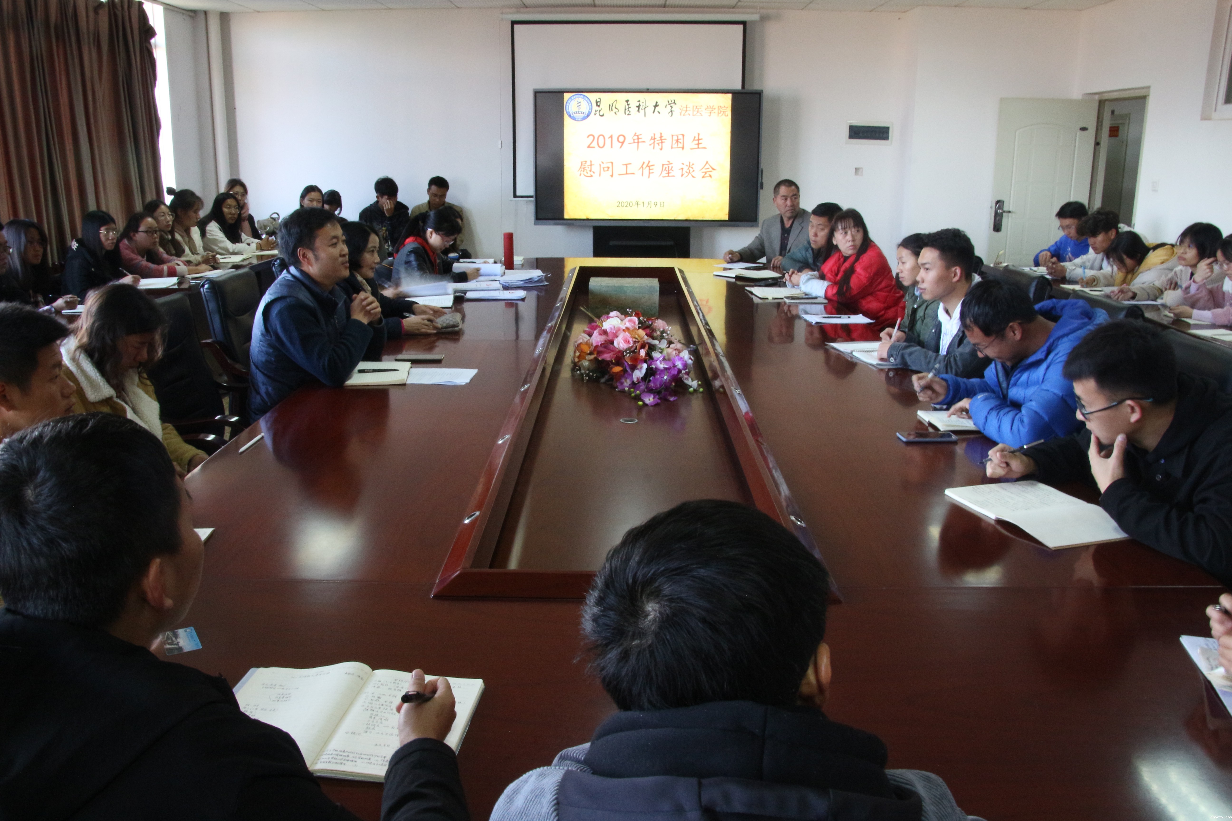 为做好学院“精准资助,资助育人”工作,结合学院“冬季送温暖 情暖冬日”活动工作方案,进一步深入了解和帮助家庭经济困难学生解决学习、生活等方面的困难,用行动驱逐寒冷,用爱心温暖冬季,法医学院于2020年1月9日上午在五楼会议室召开2019-2020年资助工作专题研讨会暨家庭经济困难学生“冬季送温暖”慰问座谈会,参加座谈会的有法医学院党委书记唐敏、专职辅导员、各班班主任及学院家庭经济困难学生代表、班团干部等师生共计60余人,会议由党委副书记马华主持。