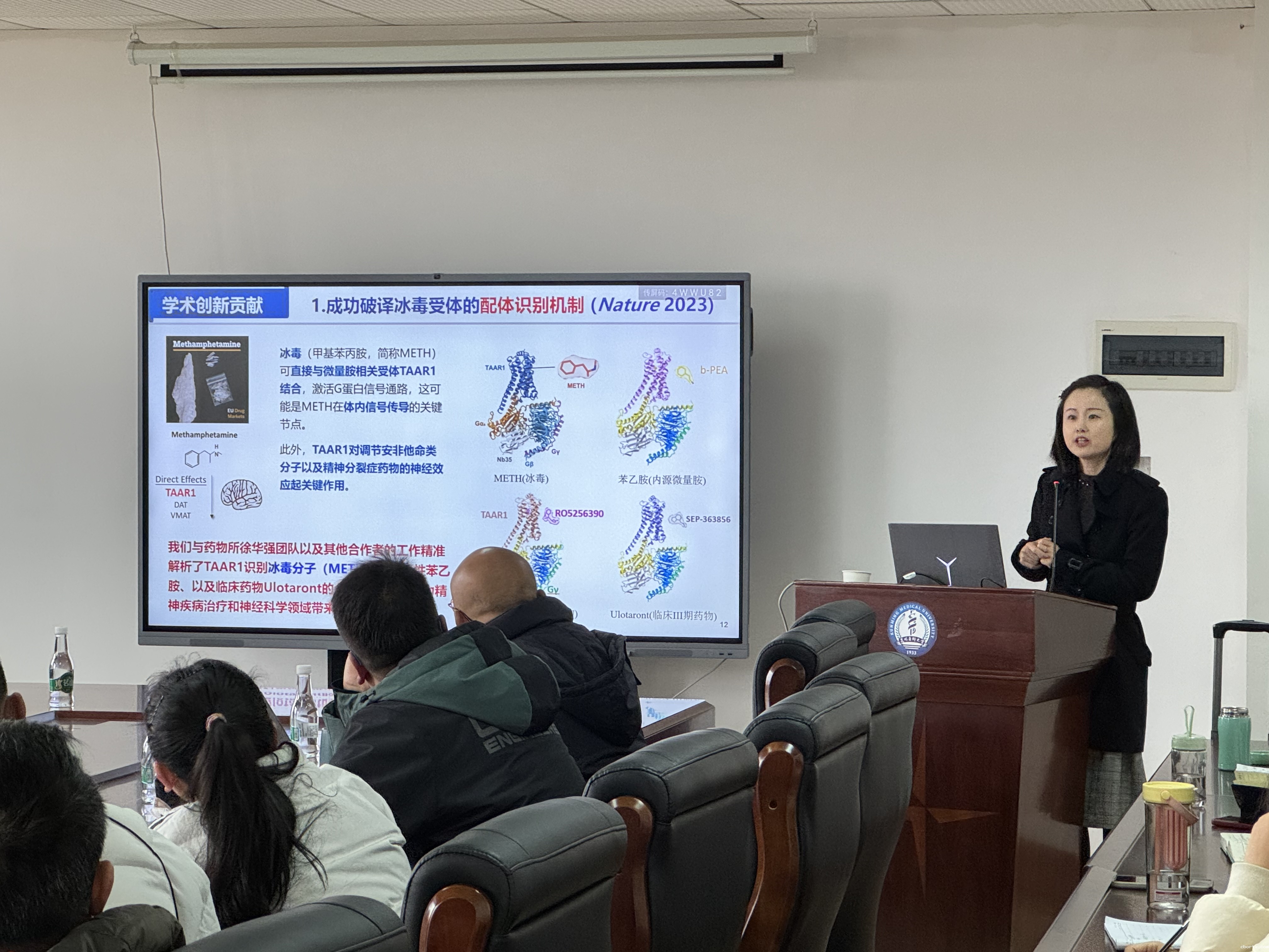徐菲教授介绍了破译冰毒受体的配体识别机制、孤儿受体独特的自激活机制、A类GPCR二聚化调控机制等方面的研究工作和成果;与参会师生进行了深入交流,探讨了下一步与重点实验室开展科研合作的思路和想法。本次学术交流活动促进了重点实验室与国内同行的学术交流,对重点实验室建设发展起到了积极推动作用。