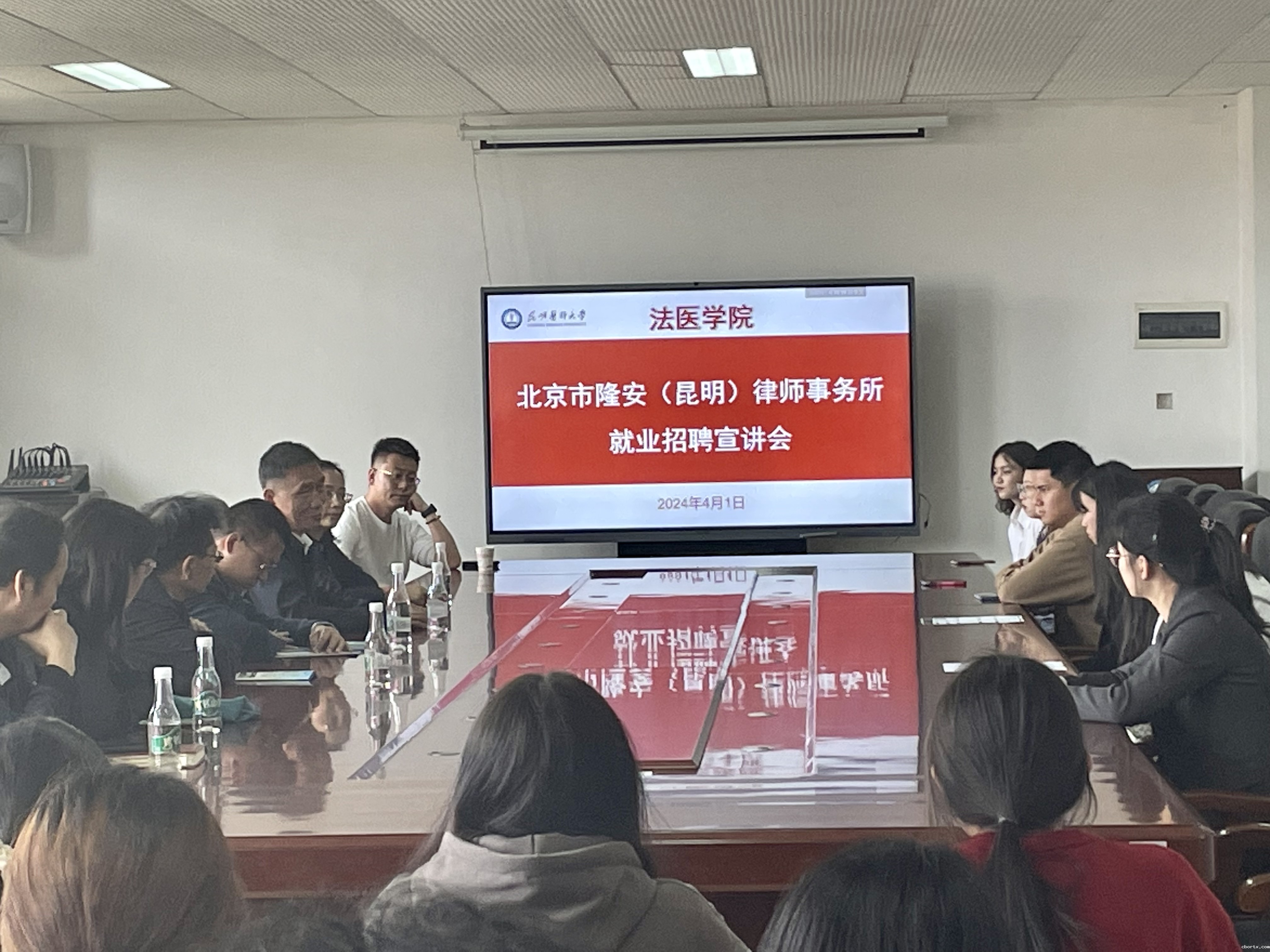 2024年41日,法医学院邀请云南北京市隆安(昆明)律师事务所、云南省昆明市明信公证处、云南天外天律师事务所大健康法律服务中心等相关单位参加“云南省2024年医药类高校毕业生专场招聘会”,并到法院学院开展就业宣讲和人才招聘工作。