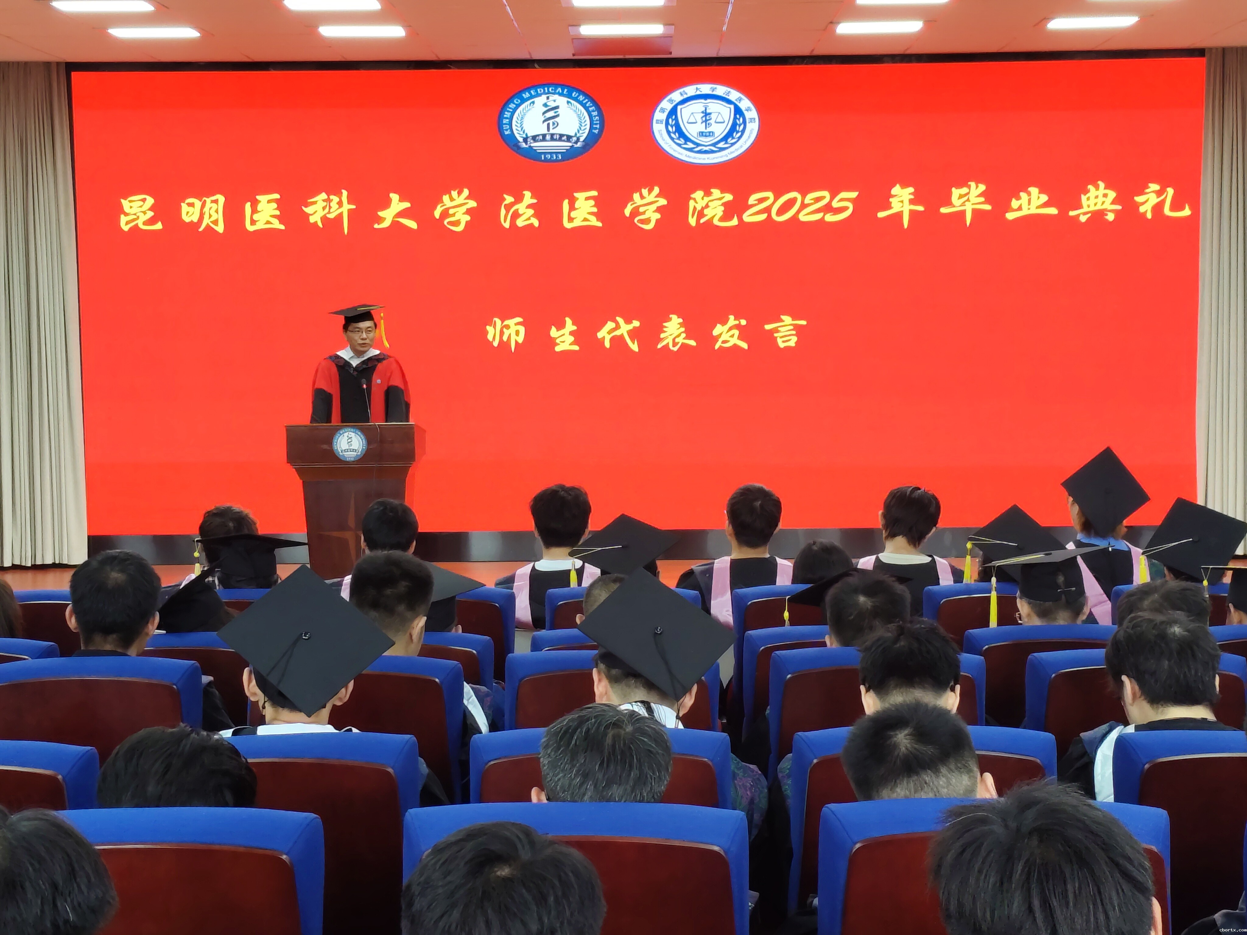 毕业典礼由法医学院党委书记唐敏主持。在学位授予仪式环节中,学院全体教师为2025届博士、硕士和本科毕业生颁发学位证书和毕业证书。学院党政领导为31名本科生升学奖获得者颁发学院奖助学金,激励全体毕业生未来继续努力奋斗。在师生代表发言环节中,毕业生代表周骏、曹婧琳发言中满含对母校的感恩与对同窗的不舍,更饱含对未来的坚定信心与热切憧憬;在校生代表王健豪、高福林表示立志向优秀毕业生代表学习,祝福毕业生奔赴山海,前程坦荡;教师代表王尚文、卢海燕勉励学子铭记为生者权,为死者言”的誓言,勇担时代责任,永葆探索真理的热情。法医学院院长洪仕君致辞,激励2025届毕业生坚定理想信念,践行社会主义核心价值观,练就过硬专业本领,并向毕业生表达了殷切期望和美好祝愿。最后,学院全体教师共同登台,为毕业生送上真诚祝福,全体毕业生向全院教师致以诚挚感谢。