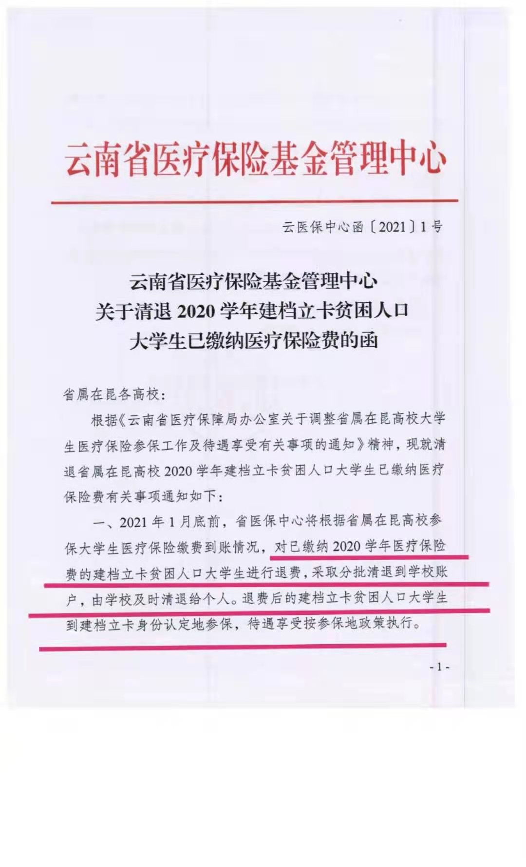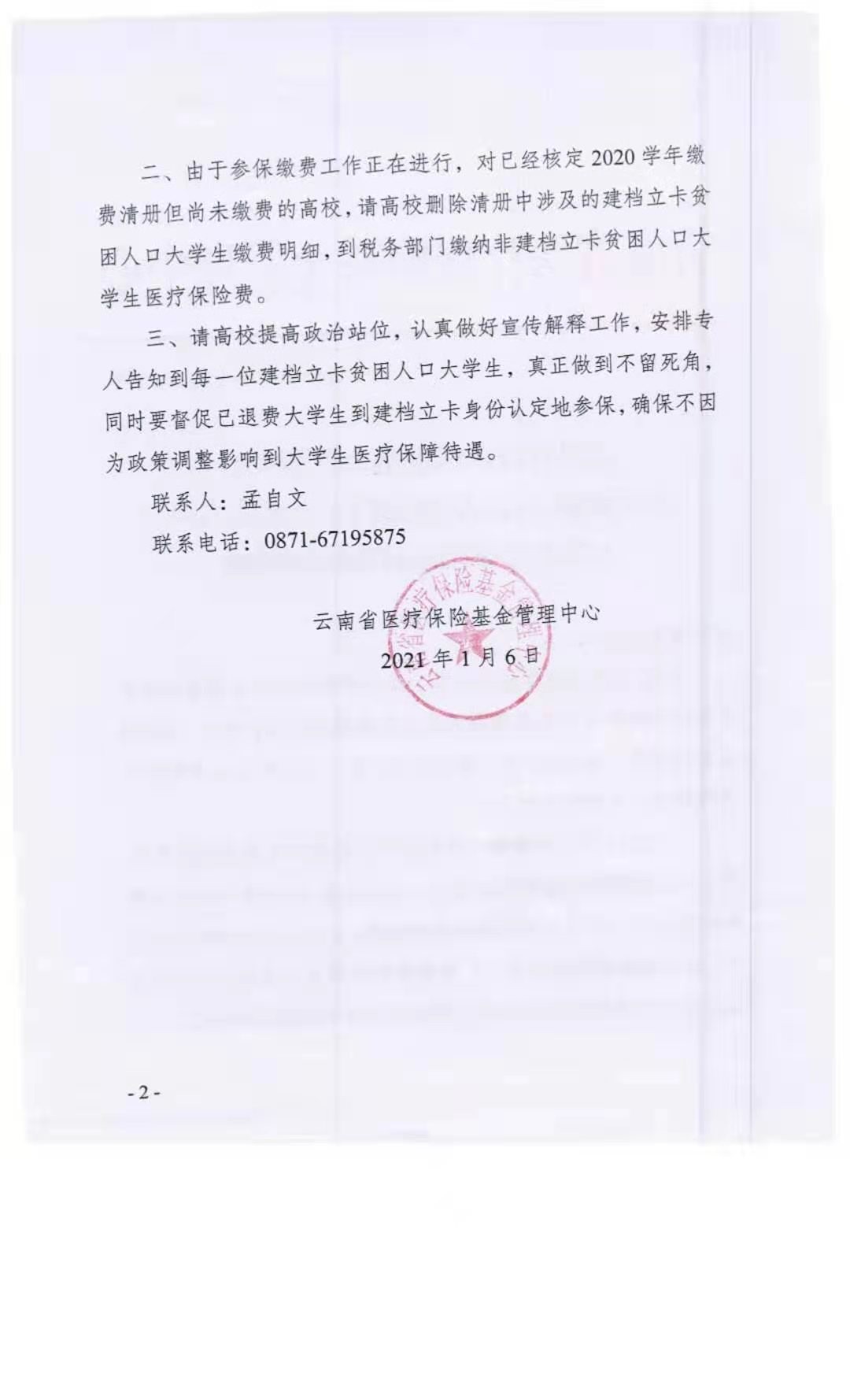 根据云医保涵〔2021〕1号文件(见附件1)及《云南省医疗保障局办公室关于调整省属在昆高校大学生基本医疗保险参保及待遇享受有关事项的通知》(见附件2)精神,现将有关事项通知如下: