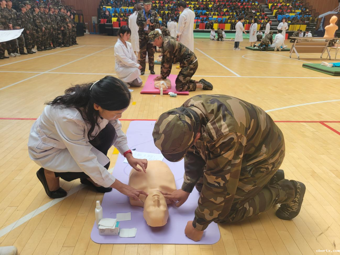 在军训期间,校医院联合学生工作部、武装部、护理学院、现教中心、青年志愿者协会共同参与举办以“守护生命 救在身边”为主题的校园应急救护培训,把心肺复苏、呼吸道梗阻急救法(海姆立克急救法)急救技能融入学生军训中,实现“全员普及自救互救”的目标。