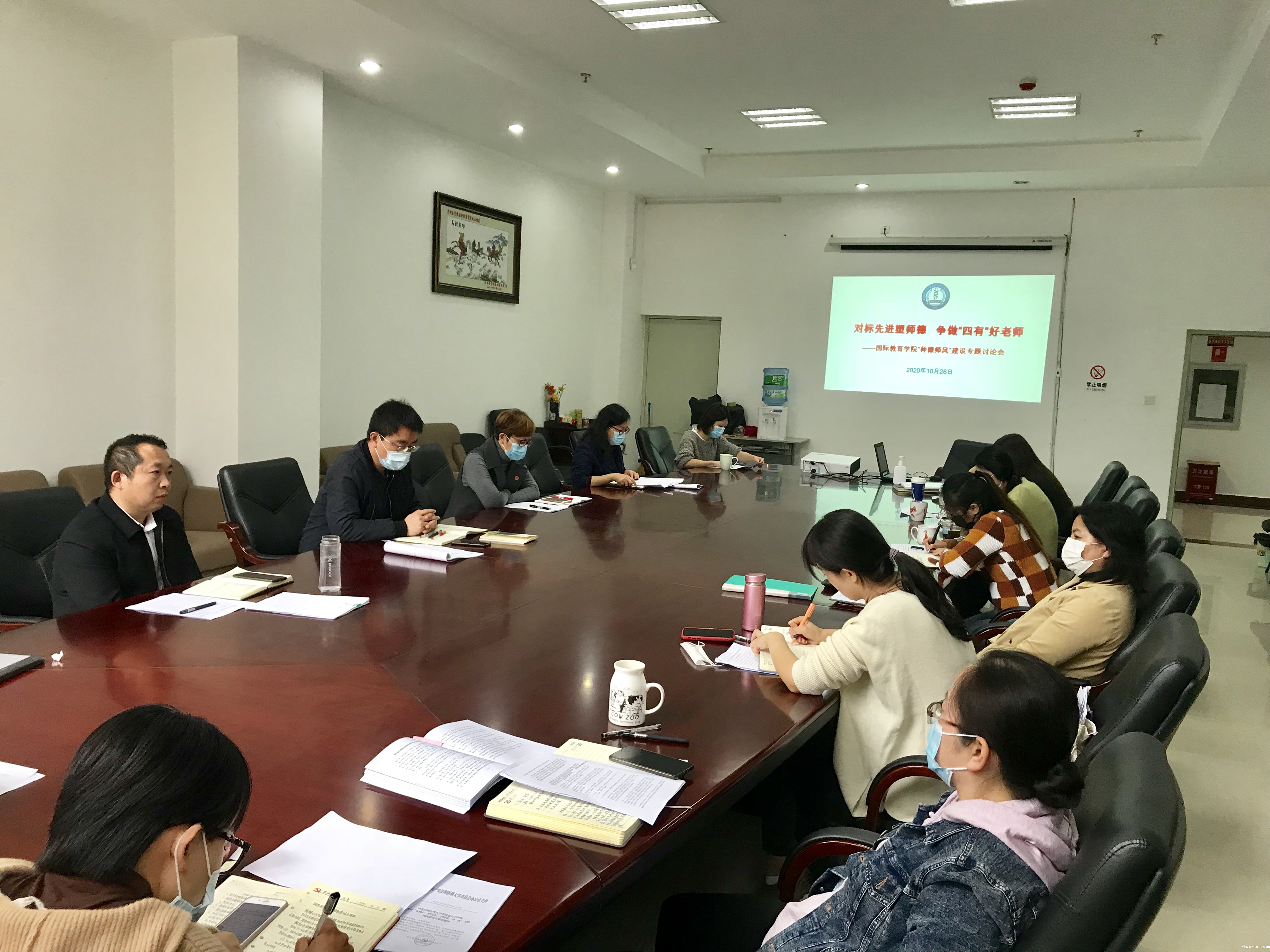 为认真学习贯彻习近平总书记关于教师工作重要指示批示精神,积极响应学校党委关于开展“守初心、担使命,学榜样、创一流”主题实践活动和开展师德师风大学习大讨论活动的要求,10月 26日下午, 国际教育学院组织开展了主题为“对标先进塑师德,争做‘四有’好老师”的师德师风建设专题讨论会。在前期学习习近平总书记关于师德师风的重要论述、考察云南重要讲话精神,学习教育部等七部门《关于加强和改进新时代师德师风建设的意见》等文件和张桂梅、蓝瑚、李秉权等典型事迹的基础上,国际教育学院全体教职工紧紧围绕师德师风建设的重要性、主要内容和强化举措等方面进行讨论交流。