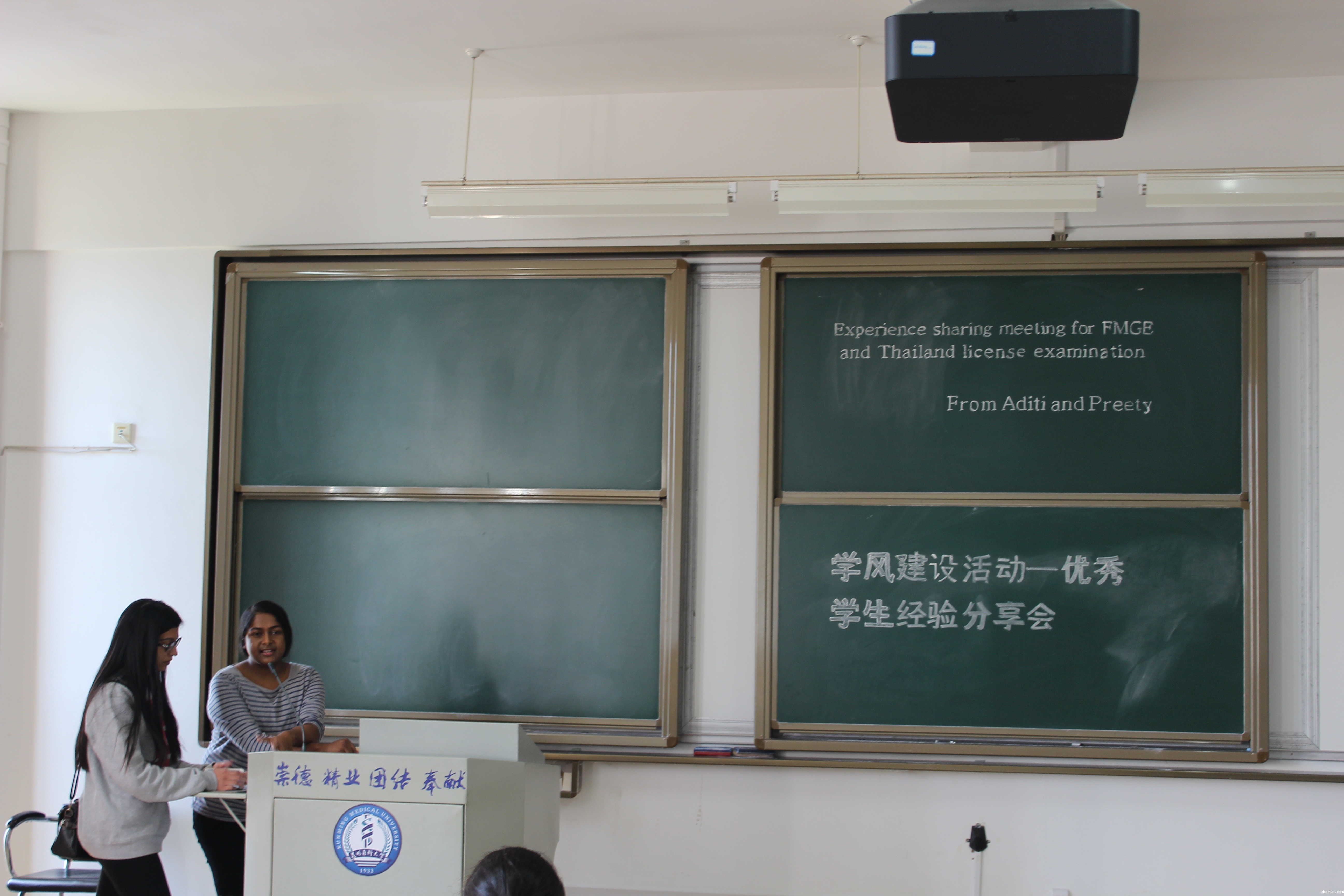 2013级印度学生Pal Aditi和泰国学生Suchonsamran Miss Preety分别介绍了本国的执业医师考试、分享了各自的备考经验以及学习心得和体会、解答了现场同学的提问。