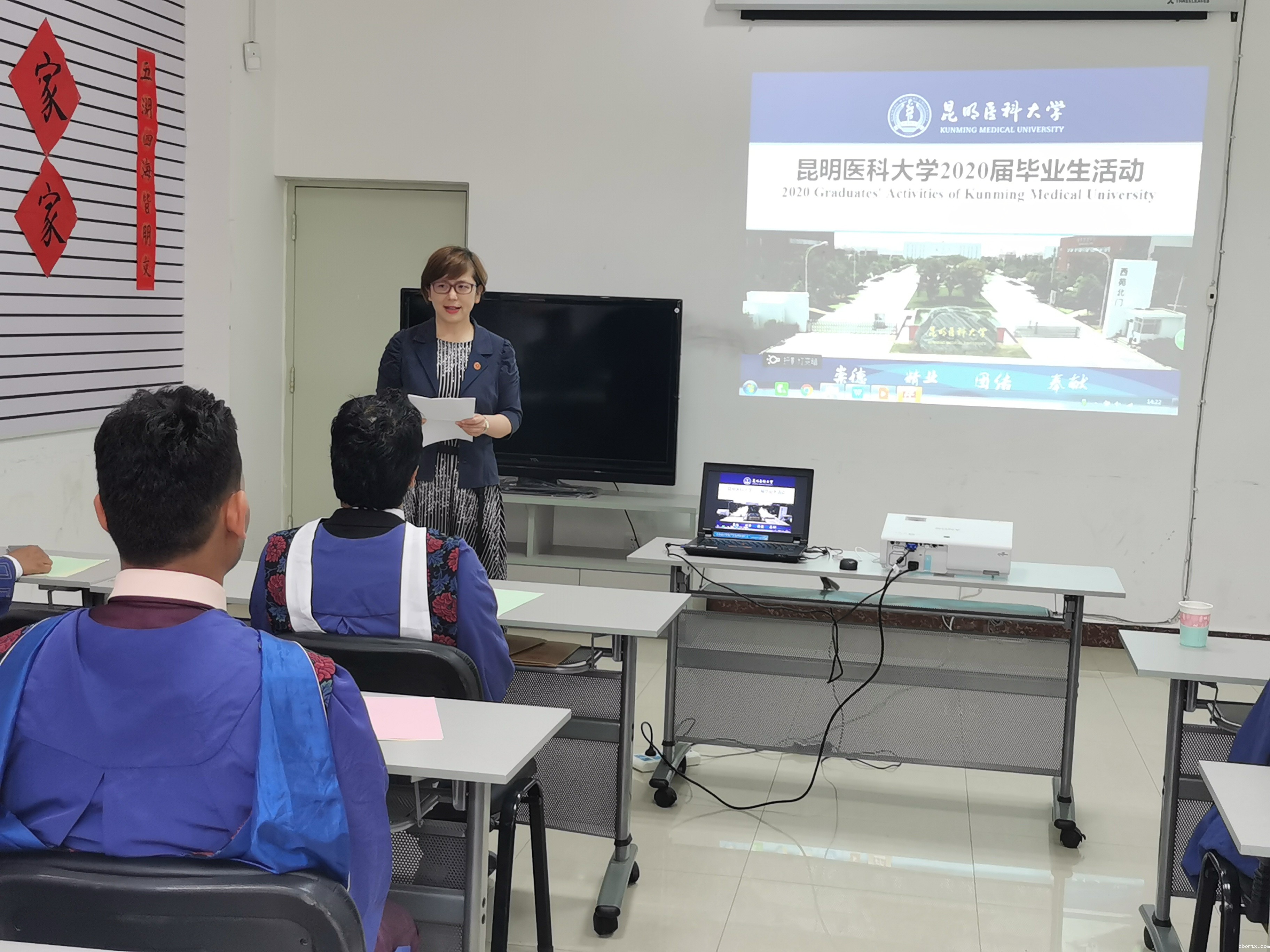 毕业主题班会在朋乐楼102活动室举行,由国际教育学院副院长屈凡伟主持。国际教育学院直属党支部书记、院长赵永娜首先致辞,向在昆留学毕业生表示祝贺,祝贺大家顺利毕业,圆满完成在中国的留学生活,期望毕业生志存高远、坚定不移、迎难而上,为构建人类卫生健康共同体做出积极的贡献。学院直属党支部副书记章小丽、副院长杨兵兵、副院长屈凡伟分别寄语毕业生,希望他们珍惜青春年华,秉承校训,为本国医疗卫生事业添砖加瓦,毕业后继续关心母校的发展,在广阔的世界舞台书写人生的精彩。接着,在座的毕业留学生现场抒发了个人毕业感言,逐一表达了对母校和老师的深深感谢,并回顾了自己在学校丰富多彩的学习生活,分享了在中国留学的美好体验和今后的梦想。留学生的精彩发言赢得在场师生的阵阵掌声。最后,学院领导和老师为今年毕业生校友联络员颁发聘书,希望他们为母校校友工作做出努力。学院为2020年所有的毕业生均准备了了毕业纪念品,当天为在场的毕业生赠送了毕业纪念品,其余毕业生的纪念品后续将通过其他方式赠送。