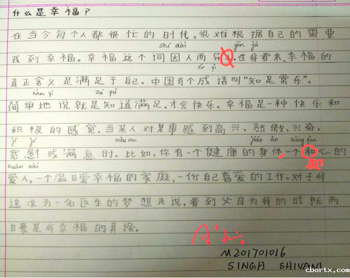 (2017级MBBS学号:M201701016 姓名:SINGH SHIVANI 中文名:施梦琪)