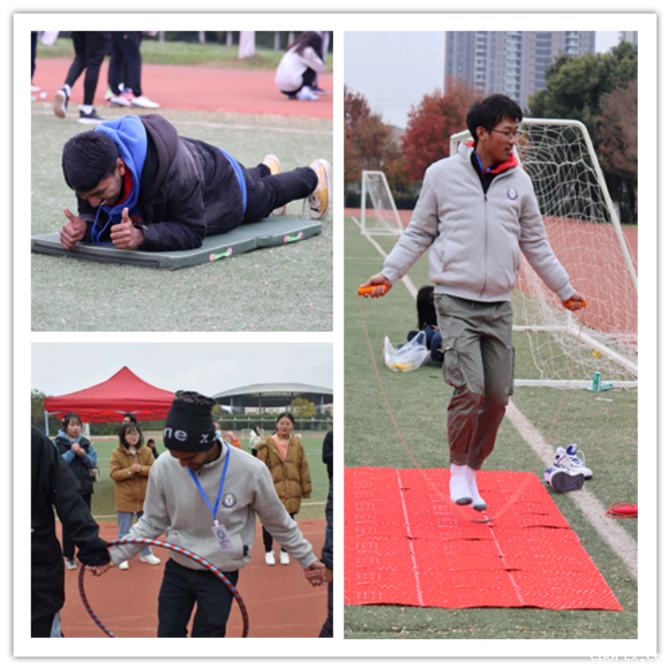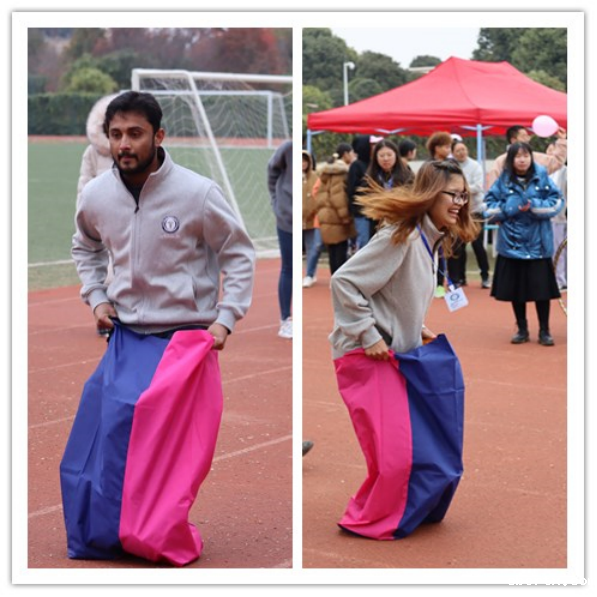 此次趣味运动会以团体赛和个人赛的形式进行,中外学生以随机抽签的形式分为四组,依次进行了“袋鼠跳接力”、“穿越呼啦圈”、“螃蟹背西瓜”、“跳大绳”等四项团体比赛。各小组的中国学生与留学生积极合作,互帮互助,互相配合得越来越好,凝聚力也越来越强。运动场上,大家的欢呼声、笑声、助威声此起彼伏。