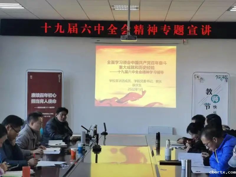 1月4日下午,学院召开学习贯彻党的十九届六中全会和省第十一次党代会精神宣讲报告会。学校宣讲团成员、学院党委书记徐庆生在209会议室作了专题报告,全体教师参加报告会。
