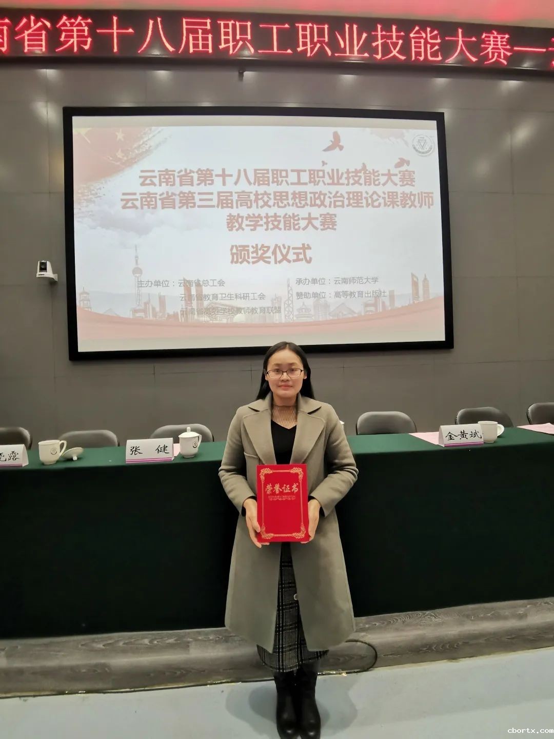 2021年11月17日至11月19日,由云南省总工会、云南省教育卫生科研工会、云南省高等学校教师教育联盟主办的云南省第十八届职工职业技能大赛(云南省第三届高校思想政治理论课教师教学技能大赛决赛)在云南师范大学呈贡校区国家教师教育教学实验中心举行。来自全省45个高校的63名选手进入决赛。在决赛阶段经过第一轮激烈的角逐,我校马克思主义学院教师颜瑾瑾顺利进入第二轮排位赛,最终获得了一等奖第二名的优异成绩,充分展现了思政课教师扎实的教学功底和较强的综合素质。