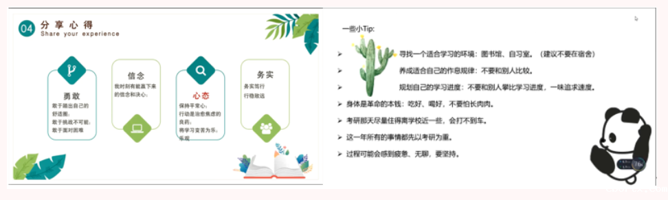 第二项议程——四位学长学姐就自己的院校专业选择、备考计划、资料准备、初试复试等内容为我们做了细致的讲解,并在自己讲解完后耐心,细心的和同学在线互动,为同学们答疑解惑。