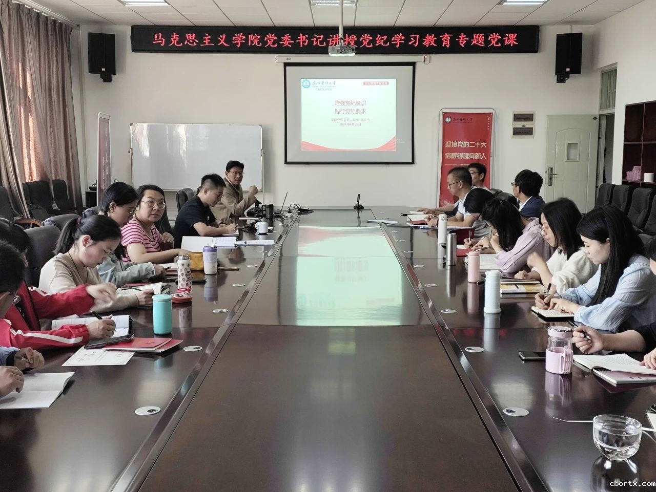 4月26日上午,马克思主义学院党委书记徐庆生在学院209会议室为全体党员教师上党纪学习教育专题党课,学院全体无课教师参加党课学习。