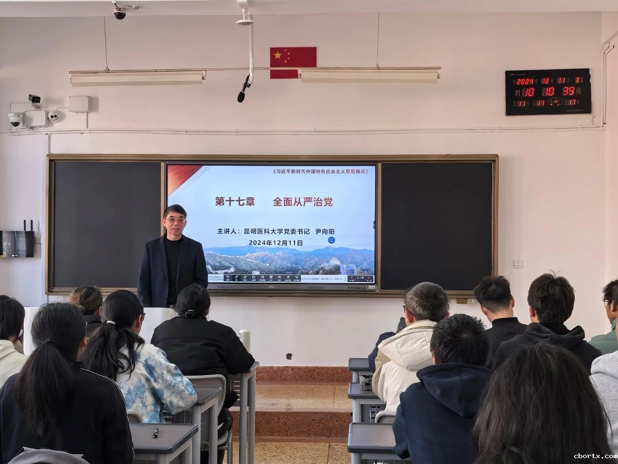 2024年12月11日上午,18luck备用登录党委尹向阳书记走进“习近平新时代中国特色社会主义思想概论”课堂,以“全面从严治党”为题,分别给2024级医学影像一、二大班和2024级临床医学交大班的同学讲授专题思政课。