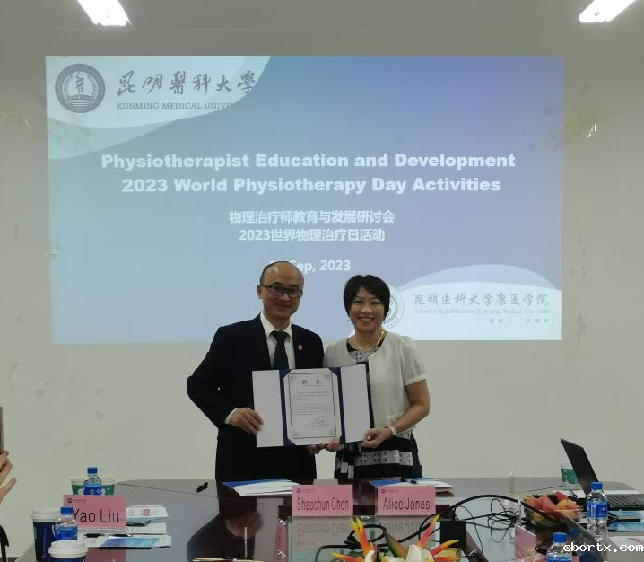 会见后,Jonathon Kruger先生一行观摩了学校康复物理治疗专业《心肺物理治疗》课堂教学,参观了康复物理治疗专业的实验室,与康复学院师生以及云南省康复医学会物理治疗专委会的委员代表进行座谈,并为师生们送上了精彩的讲座。外宾和师生围绕学校康复物理治疗专业的发展、国际认证、人才培养等方面的合作进行深入交流,并为康复物理治疗行业从业人员的职业发展、行业组织建设等方面给出了宝贵的建议。Jonathon Kruger先生和专家对学校将物理治疗(Physiotherapy,PT)与作业治疗(Occupational therapy,OT)作为独立专业进行办学的方式表示赞赏,并对两个专业优良的办学水平给予了高度评价。此次来访的Alice Jones教授自康复学院建院伊始就担任康复物理治疗系的名誉系主任,在学院人才培养、师资队伍建设、对外交流合作、专业国际认证以及国家一流专业建设等方面给予了大力指导和支持。访问期间Alice Jones教授与学院续签了名誉系主任聘用协议,将继续为康复物理治疗专业的高质量发展给予积极支持。