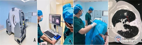 图1A、B为复合手术室CT及其操作系统;C为左S6结节消融术;D为消融后即时CT影像