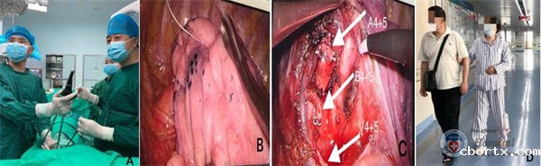 图2:A、B、C为术前定位后楔形切除、左肺舌段切除术中所见; D为患者术后第一天下床活动
