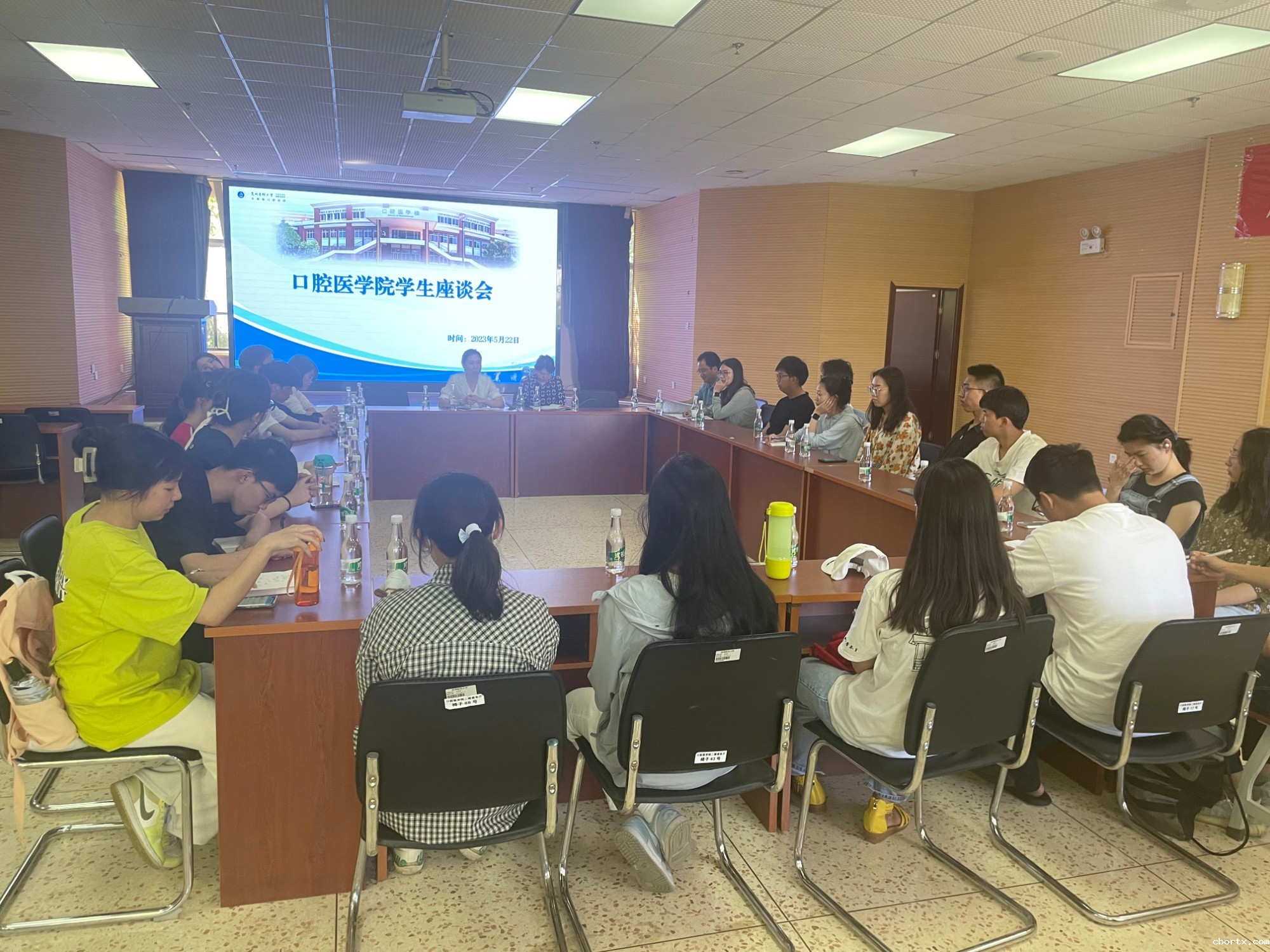 5月22日下午,口腔医学院组织召开学生座谈会。院党委副书记毛瑞、副院长杨春,以及学生工作管理办公室和教学管理办公室、科教科相关负责同志参会,24位学生代表参加座谈。