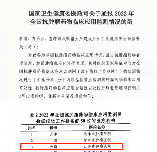 近日,国家卫生健康委医政司公布了全国抗肿瘤药物临床应用监测情况,医院在2022年度全国抗肿瘤药物临床应用监测网(以下简称“监测网”)数据上报工作中表现突出,取得全国第三名的好成绩。