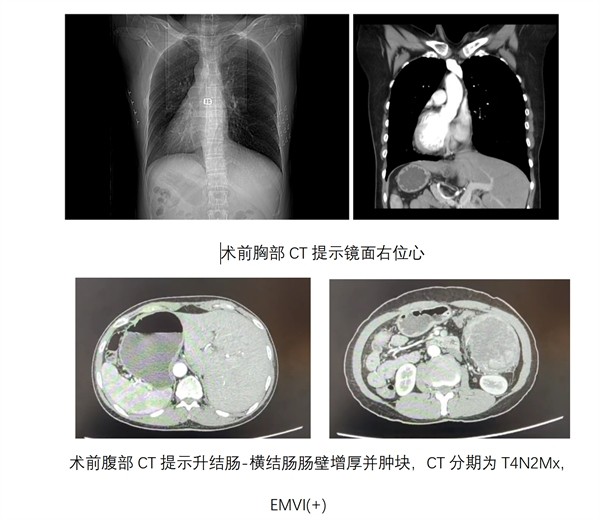 患者是一名65岁的女性,因大便带血伴间断腹胀1个月入院。结肠镜提示结肠肿瘤,胸腹部CT提示镜面右位心,升结肠-横结肠肠壁增厚并肿块,CT分期为T4N2Mx,EMVI(+),患者左上腹部可扪及包块,质硬,且活动度差。