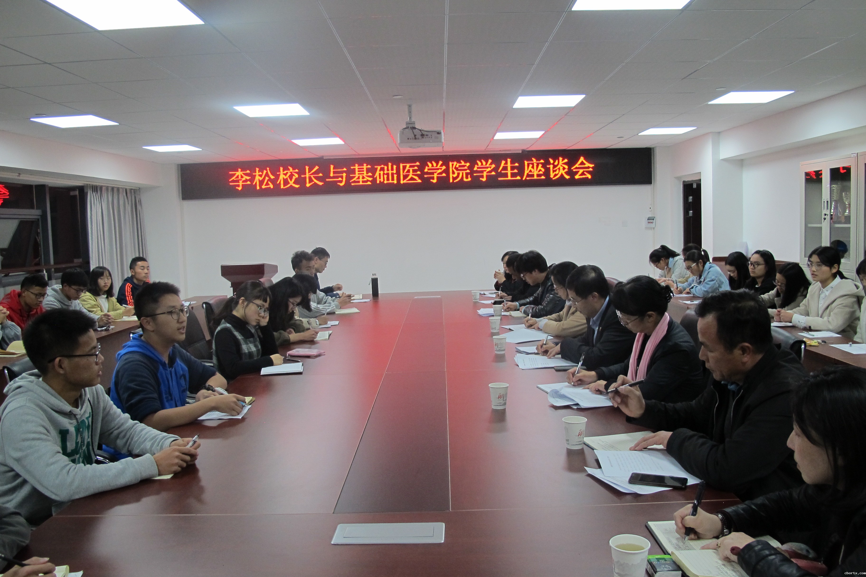 12月4日晚,校长李松一行到基础医学院会议室与2018级临床八大班同学进行座谈交流,校办、教务处、学生处、资产管理处、保卫处、后勤服务发展中心等相关部门负责人,校办党支部有关同志,基础医学院负责人、辅导员参加了座谈。