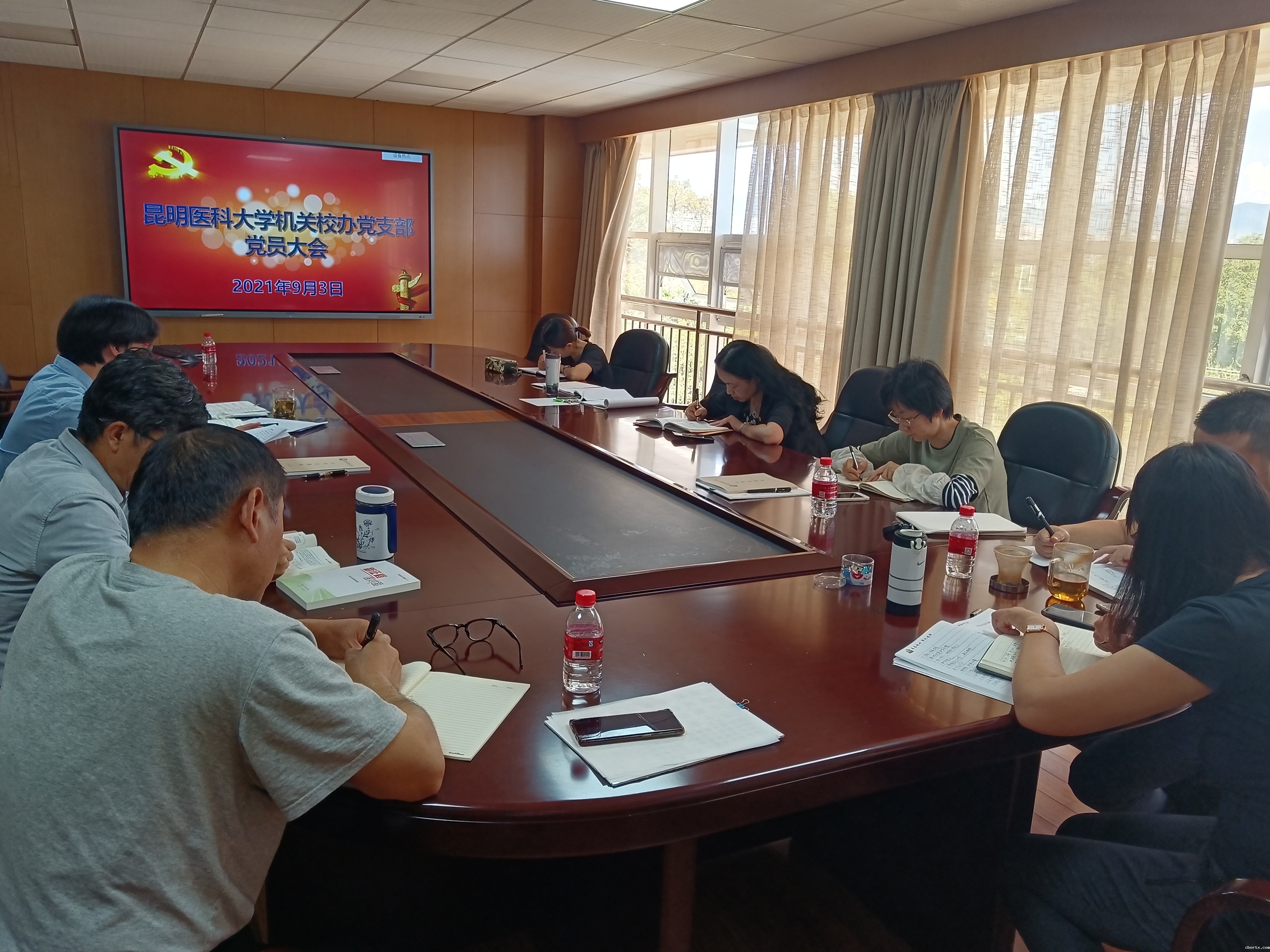 9月3日下午,校办支部在校务管理中心第五会议室召开支部党员大会,平政校区管委会、经管办学点党员通过网络视频方式参会。