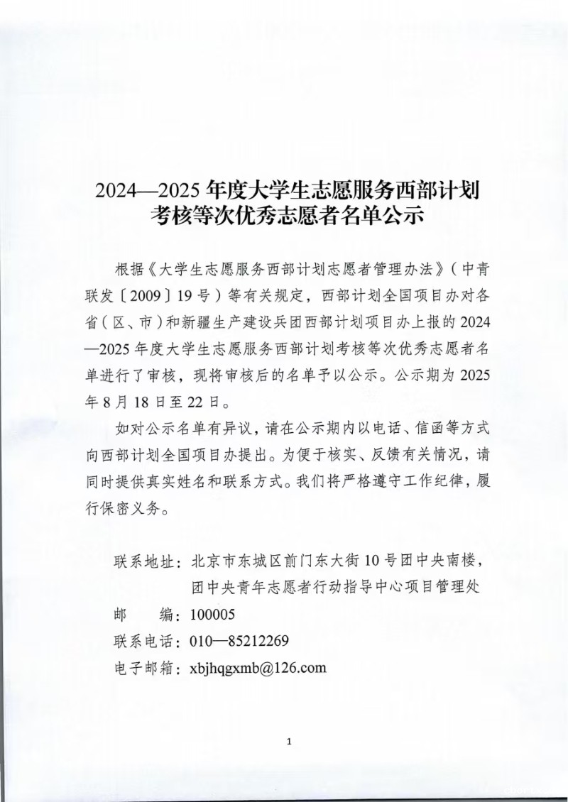 近日,西部计划全国项目办根据《大学生志愿服务西部计划志愿者管理办法》(中青联发〔2009〕19号)等有关规定,西部计划全国项目办对各省(区、市)和新疆生产建设兵团西部计划项目办上报的2024-2025年度大学生志愿服务西部计划考核等次优秀志愿者名单进行了审核,我校西部计划志愿者李蕊、李燃、张家茂、李雨洁获评大学生志愿服务西部计划考核等次优秀志愿者。他们用实际行动诠释了新时代青年的责任与担当,为西部的发展注入了蓬勃的青春活力,下面就和团团一起来看看他们西部之旅中的收获吧!