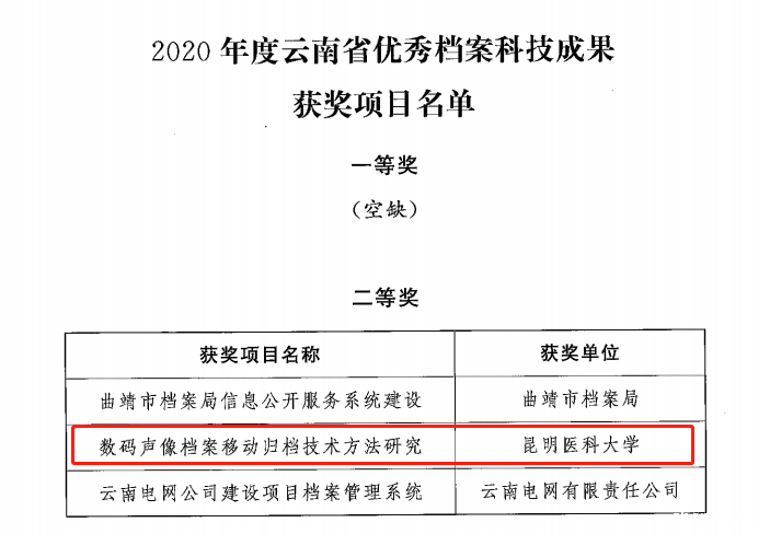 近日,云南省档案局公布了2020年云南省优秀档案科技成果评审结果。经专家评议会评审,并经省档案局审定,我校《数码声像档案移动归档技术方法研究》项目获得2020年云南省优秀档案科技成果二等奖(一等奖空缺),此次是我校第三次获得省级优秀档案科技成果奖。