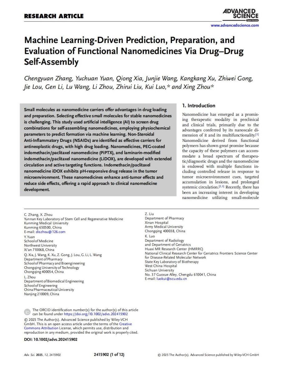 C.Zhang, Y.Yuan, Q.Xia, J.Wang, K.Xu, Z.Gong, J.Lou, G.Li, L.Wang, L.Zhou, Z.Liu, K.Luo, X.Zhou, Machine Learning-Driven Prediction, Preparation, and Evaluation of Functional Nanomedicines Via Drug–Drug Self-Assembly. Adv. Sci. 2025, 12, 2415902.