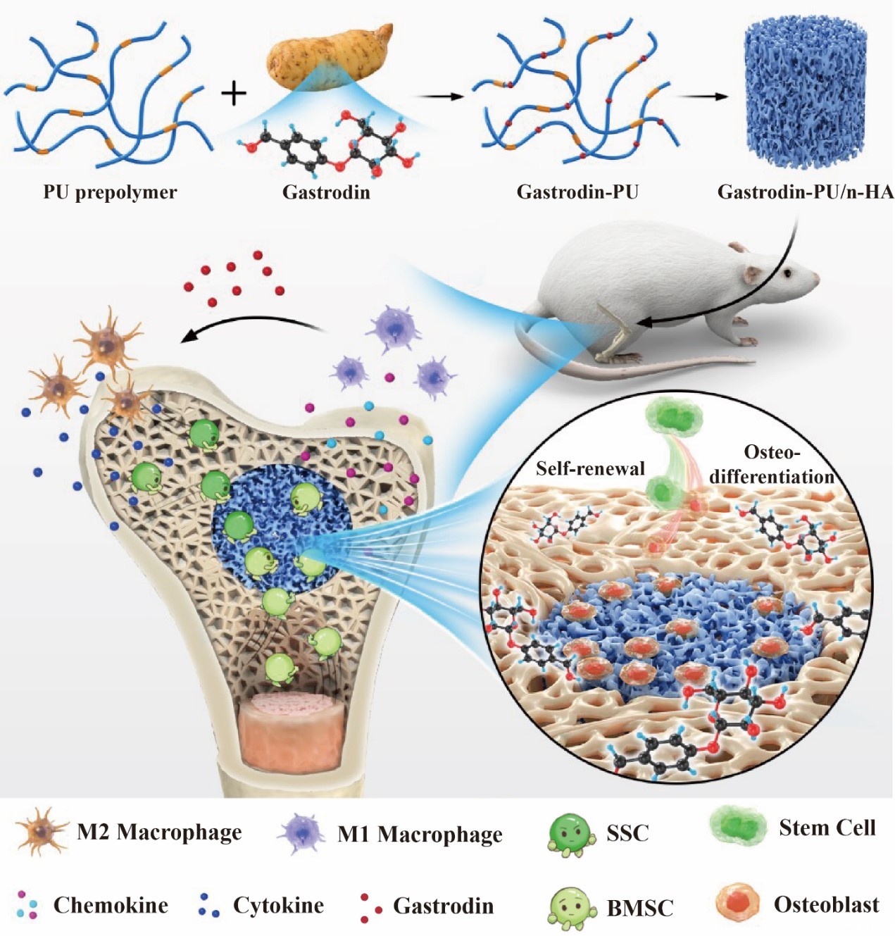 骨质疏松症和临界骨缺损已成为影响人们健康和生活的重要疾病,由于骨稳态失衡打破了干细胞维持自我更新和定向分化之间的平衡,导致骨缺损内源性修复严重不足。基于此问题,研究团队开发了一类天麻素缓释聚氨酯复合支架,通过营造良好的骨免疫微环境促进内源性骨组织再生以修复骨缺损。
