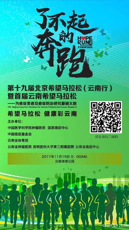 以“希望长跑健康长伴”为主题的2017北京希望马拉松将于11月19日在云南海埂公园鸣枪开赛,活动将通过爱心募捐、健康义诊、科普展览、健康大讲堂等多种形式,呼吁人们共同为癌症患者、为癌症防治研究事业贡献力量。义跑全程长5公里,规模约为1500人。设5公里公益跑与1公里亲子公益跑两个项目,其中,5公里公益跑名额1200人,1公里亲子公益跑名额100个家庭。参跑人员可以通过云南省肿瘤医院 18luck备用登录第三附属医院 云南省癌症中心的官方网站、微信公众号、爱燃烧APP报名平台报名。
